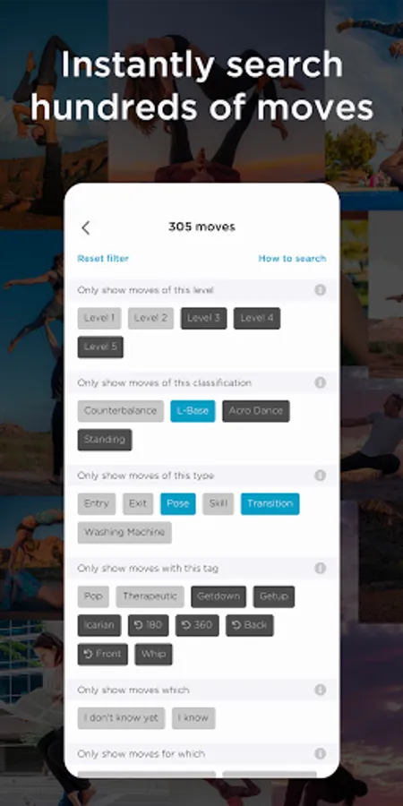 • AcroBody’s powerful filter enables you to instantly divide results by various categories such as skill level, L-basing, counterbalances, standing, acro dance, washing machines, icarian pops, getups, pops, etc.