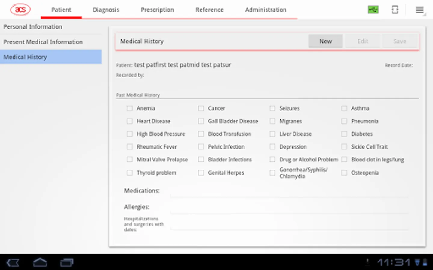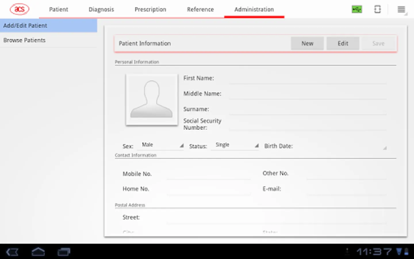 The ACS-Medical Practitioner Demo application allows doctors to register a patient card, update and view the patient’s personal information, present medical condition, medical history, diagnosis, and prescription. The patient’s personal information, present medical condition and latest prescription are saved in the patient card.