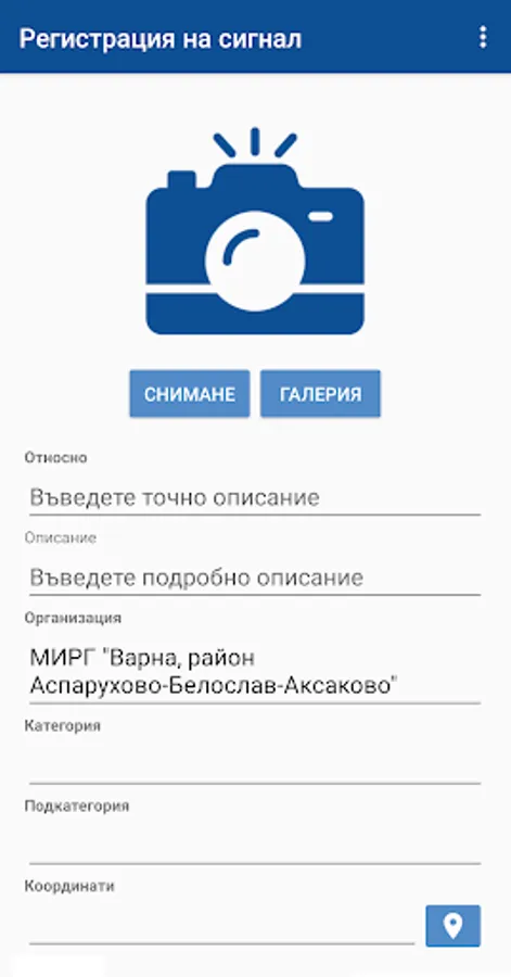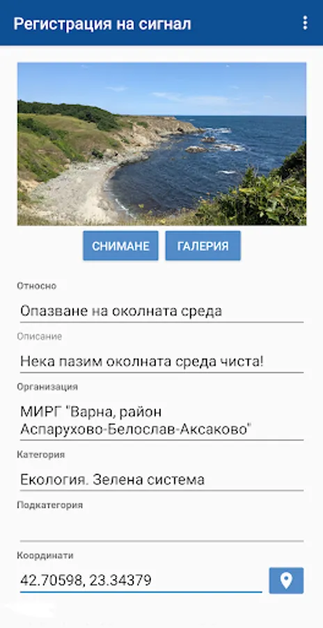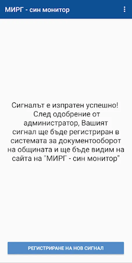 "MIRG - blue monitor" mobile application, which enables reporting of discarded waste and endangering the environment and water wealth on the territory of MIRG by locating the location of the problem, attaching photographic material and submitting signals directly to the competent administrations of the base of an analysis of the geographical location of the reported event.
