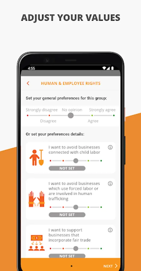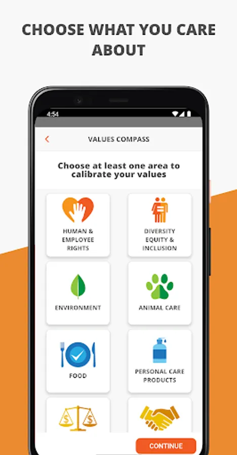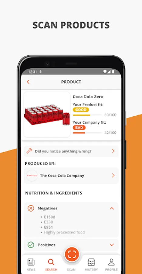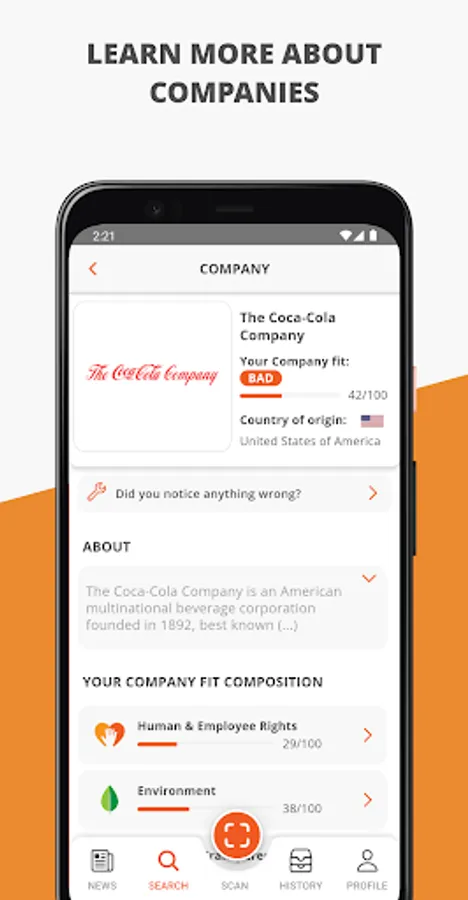 Scan product barcode, or search companies to discover how they rank based on Your Values.
