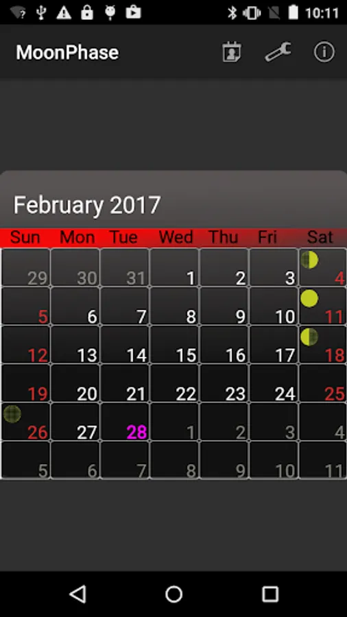 MoonPhase shows the current moon phase, the time of moonrise and moonset, the lunar phase over a month.