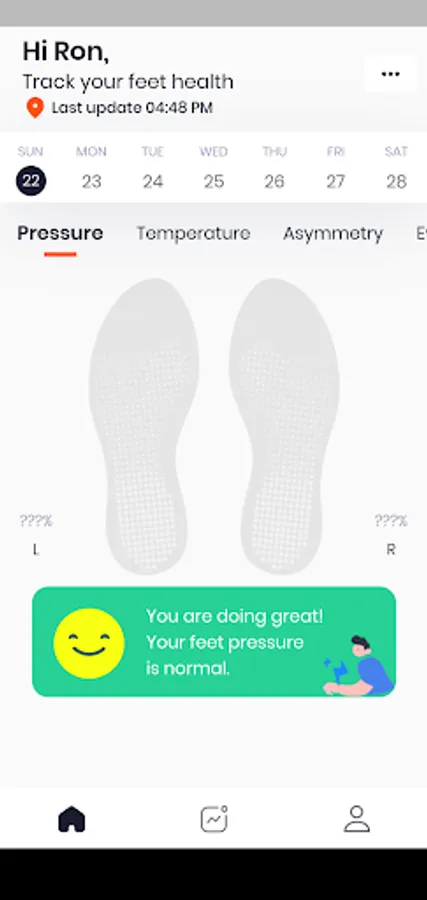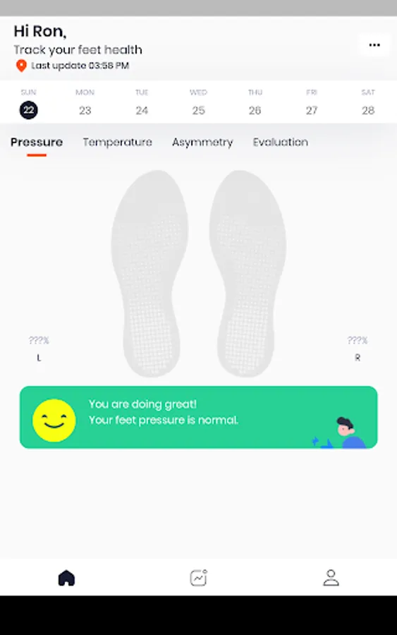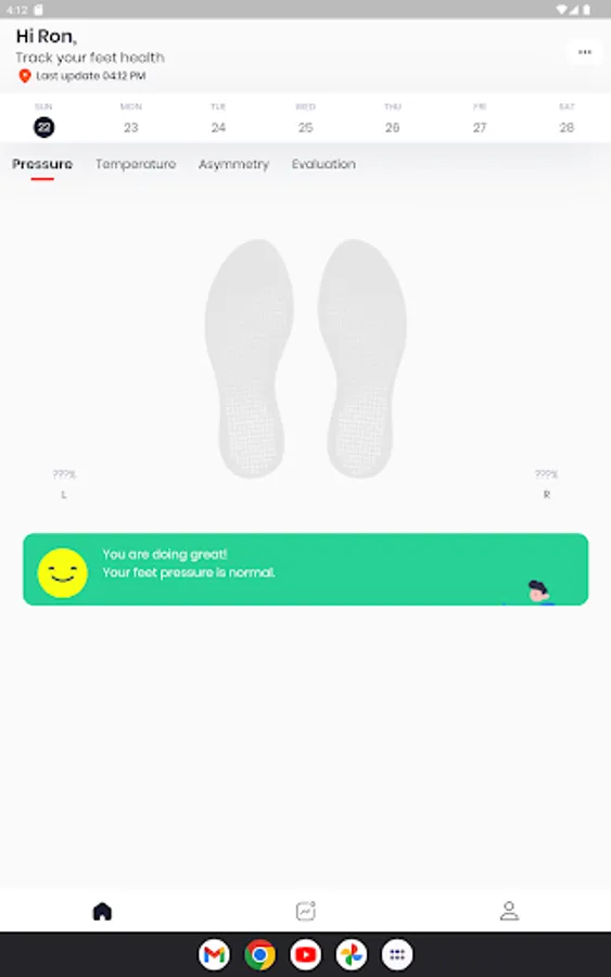 Pressure and temperature data are shown for each day (if there are any saved records on the server) on the matched screens and the analyzed alerts massages are shown at the bottom if any. Also, the Evaluation screen is there for you to interact with the insoles and let your doctor check they are calibrated as well. The app also allows you to record the data from your insole and upload it to the server for later analysis.