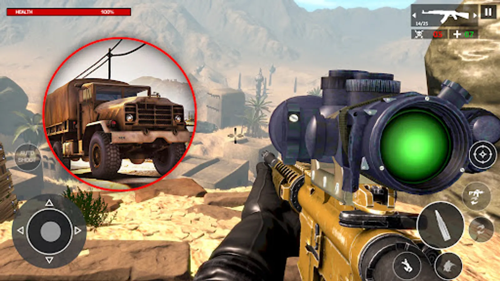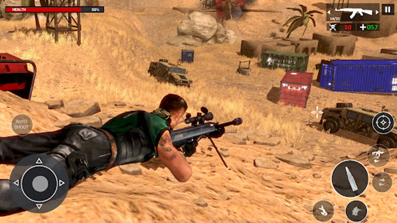 Desert Sniper 3d Special Ops is an offline game where you will use elite fighting skills to kill dangerous terrorists and save the nation. Select your target! Be careful on firing battleground missions in this offline sniper games combat. Protect the country from destruction and chaos just as you did in 2021 games. The army has provided you with Military Resources which include advanced weapons for firing. So, take on and equip yourself against terrorists in fps gun games. The 3d battlefield situation is critical, there might be special ops critical strikes to refrain from a complete dead situation. This is the call of a war duty strike to complete counter terrorist missions, this time with a more modern fps warfare arsenal in 2022.