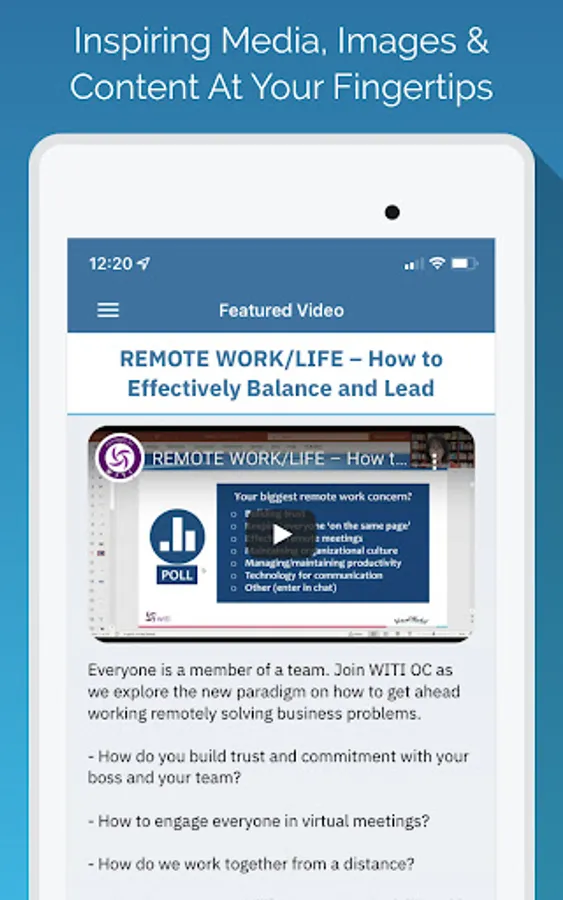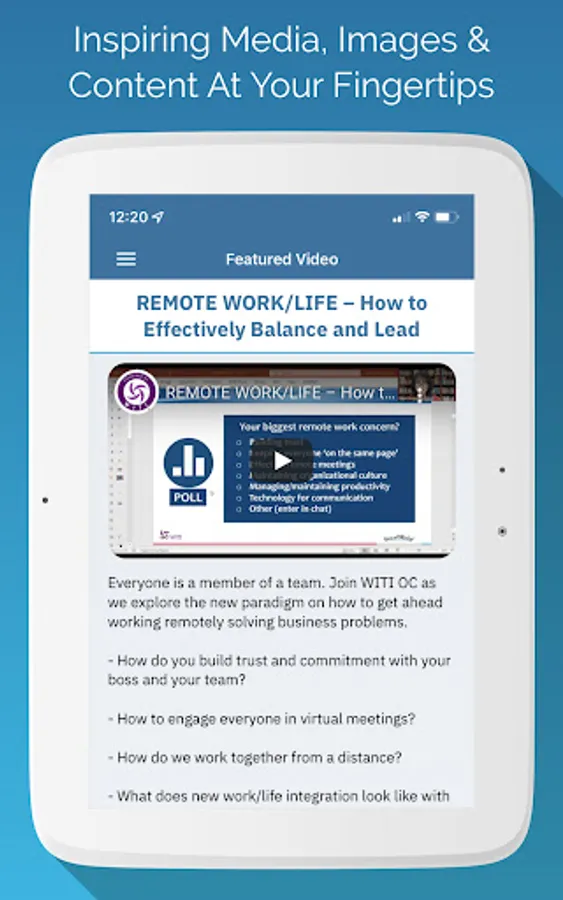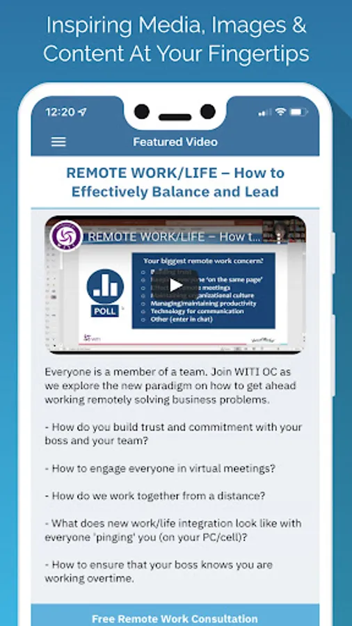 The VirtualWorks! app includes helpful information, tools, and learning resources for leaders and teams. This app includes a wealth of free ways to work effectively, lead more skillfully, and live a more satisfying and balanced life in the digital age. As the workplace shifts to include more hybrid, virtual, and work-from-anywhere options, find information here to help you thrive in the 'next normal' of work and life.