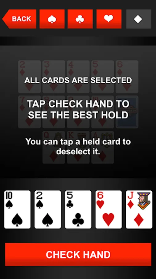 3. Tap the Check Hand button and the app tells you which cards to hold for the highest expected value