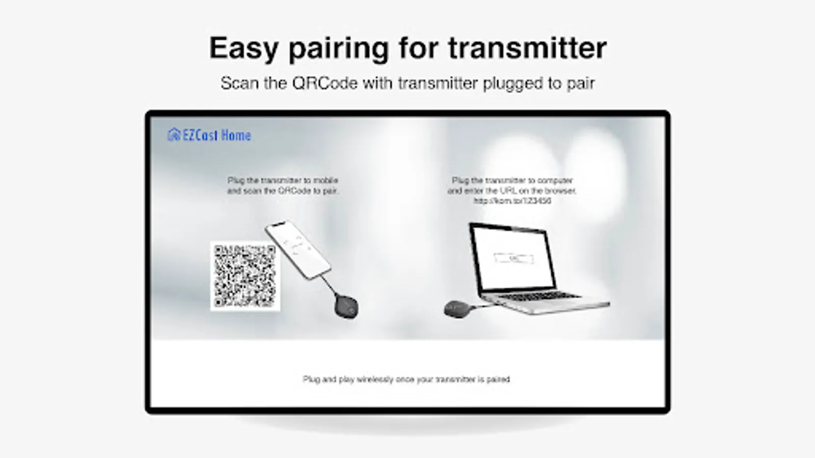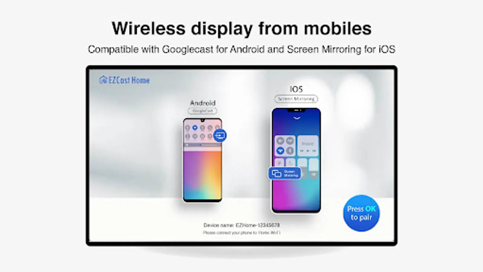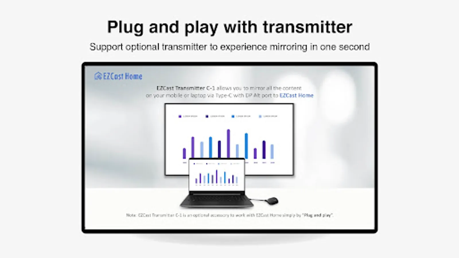 Download EZCast Home App on your smart TV/ projector to cast your device's screens on. Support multiple OS and devices with many kinds of casting protocols including GoogleCast, iOS Screen Mirroring, and EZCast casting. With our EZCast transmitter, you can further enjoy mirroring your contents in seconds by simply plug-and-play. Note that only when the transmitter has been casted, the watermark will be removed.