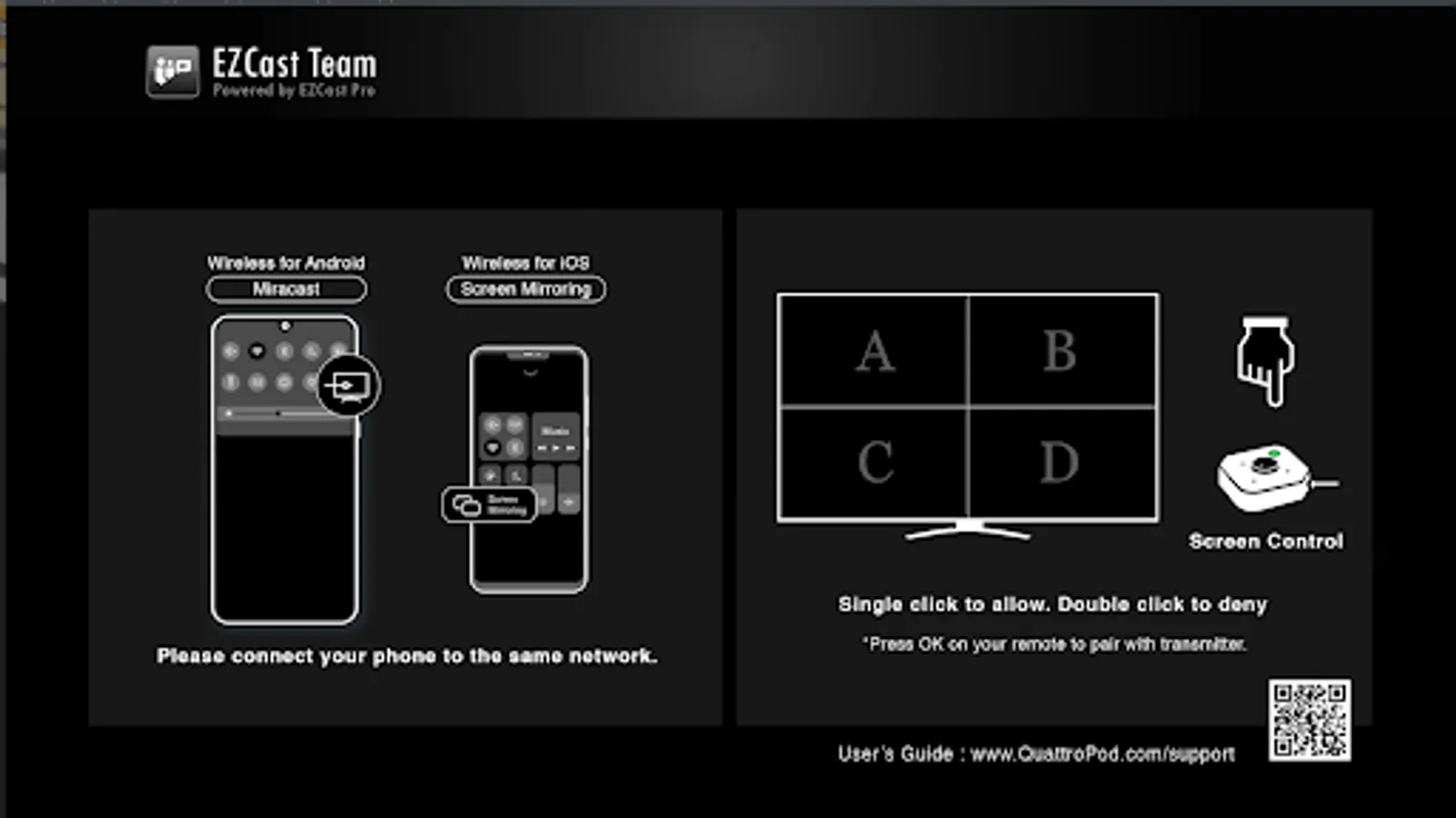 Download QuattroMeets App on your smart TV/ projector to cast your device's screens on. Support multiple OS and devices with many kinds of casting protocols including GoogleCast, iOS Screen Mirroring, and QuattroPod mirroring.