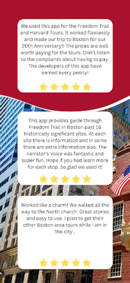 "The freedom trail tour was great. Wife and I shared a pair of wireless earbuds which I recommend. The tour is broken into many small sections which automatically stayed as we walked to the next point on the trail. All based on gps location. It all worked perfectly, was extremely easy to use and very informative. Very cheap for a guided tour. Highly recommend”
