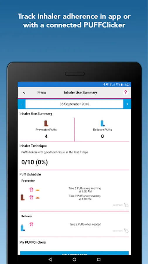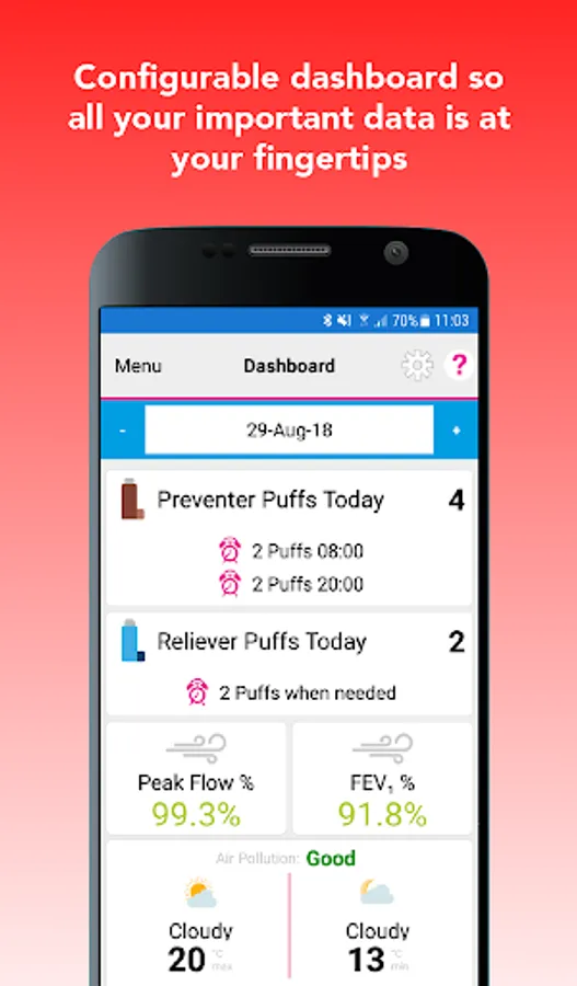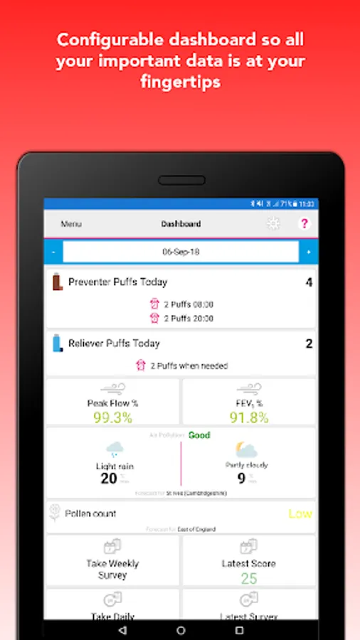 2. Wireless connectivity to self-monitoring devices: Connect PUFFClicker inhaler trackers, Peak Flow/FEV1 monitor, BuddyBand2 Activity Tracker, Body Analyser Smart Scales to monitor key physiological signs.