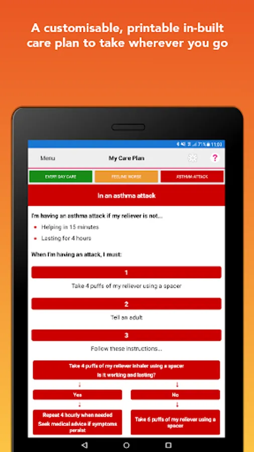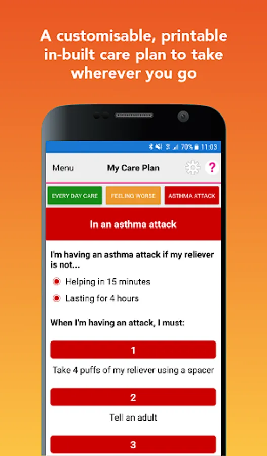6. Care Plan: Asthma+me brings together all of your child(ren)’s information in one, easy-to-read and printable or emailable Care Plan. EVERYONE with asthma should have a written care plan. Print and give to schools, friends, family, carers, GP and Hospitals to give clear instructions in the event of an asthma attack.