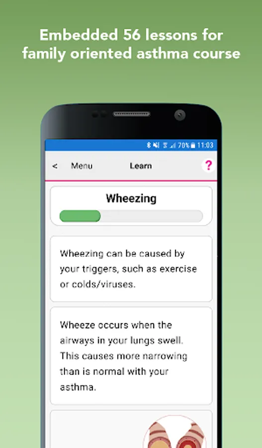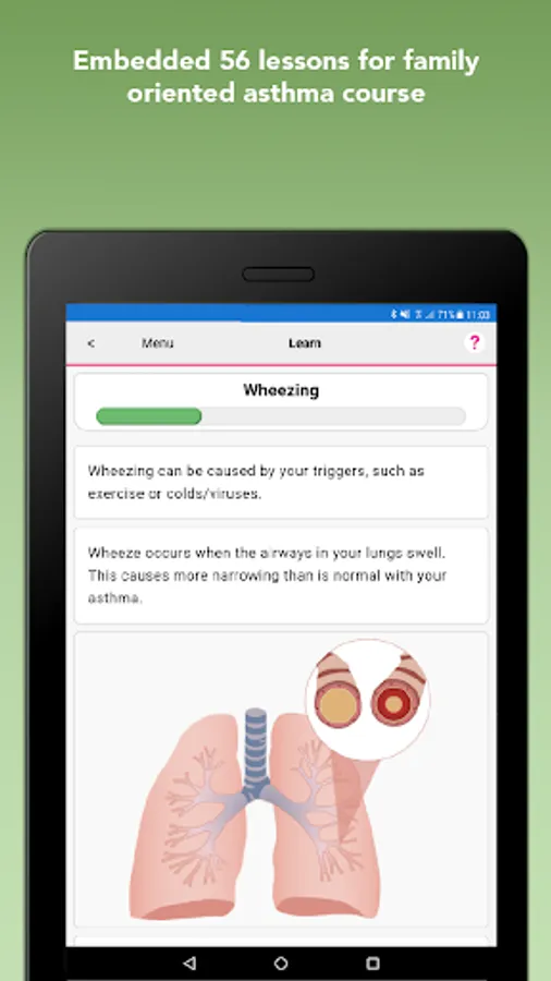 1. Clinician-approved Education syllabus on Asthma management: series of 56 simple lessons delivered daily, provided training and instruction for the family. Included at the end of each lesson is a simple quiz to confirm understanding.