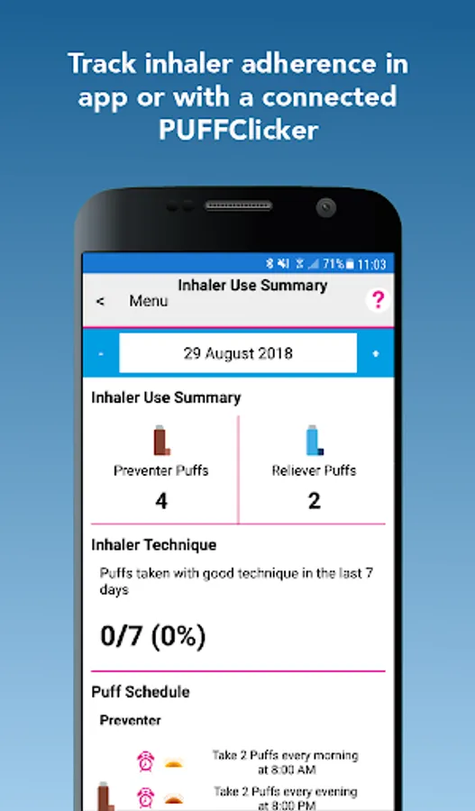 Asthma+me is a mobile application intended for use in the home to assist people to receive and review information from connected medical and non-medical devices, track medication use and record other events such as asthma attacks, for effective health self-management. The user also can share the data via sharing functions.