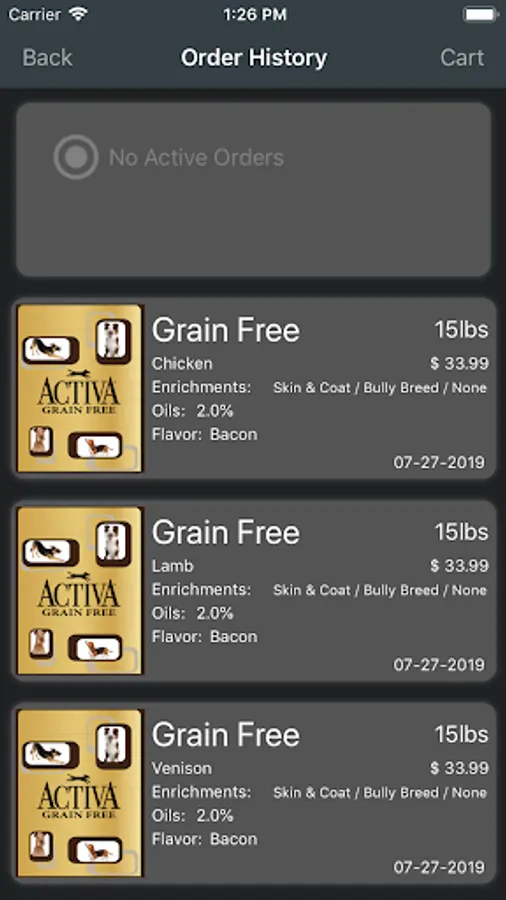 - With a million things happening throughout the day, the last thing you want to do is remember your pet's custom formula. The Activa Custom app is linked to your Pets Barn rewards account. Through this, you can easily access your order history on the app! The best part? Simply select previous orders and seamlessly reorder them.