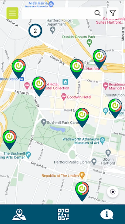 The default setting of the map is to zoom to the nearest couple of locations to the user. Chargers can be found either by navigating the map or searching in the search bar at the top.