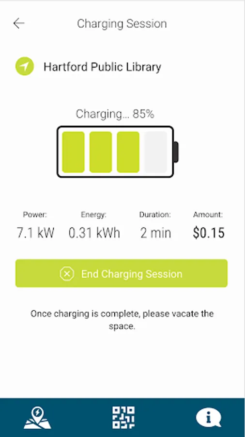 The user can scan a connector’s QR code at a given location and the app will automatically navigate to the “Start Session” page for the appropriate connector.