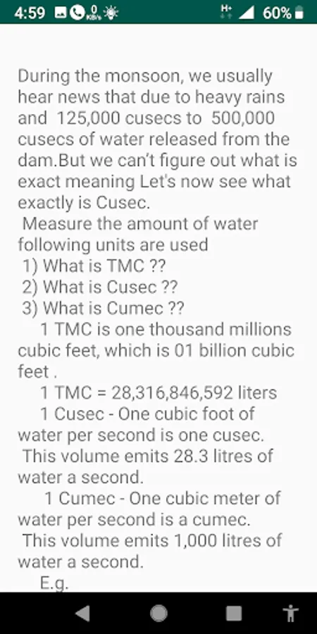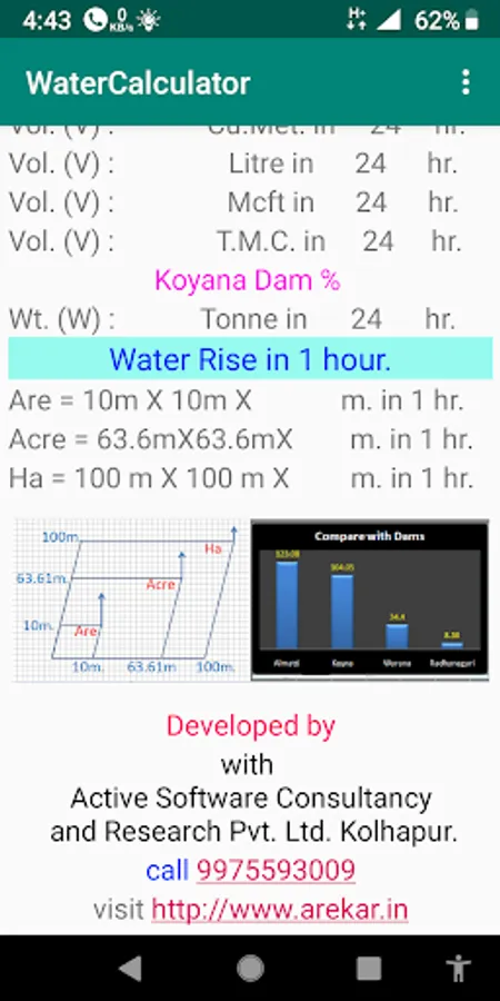 This app gives comparision of Volume calculations with LARGE dams of 100 TMC capacity. and Visualises user by giving water rise calculations in Are,Acre and Ha.