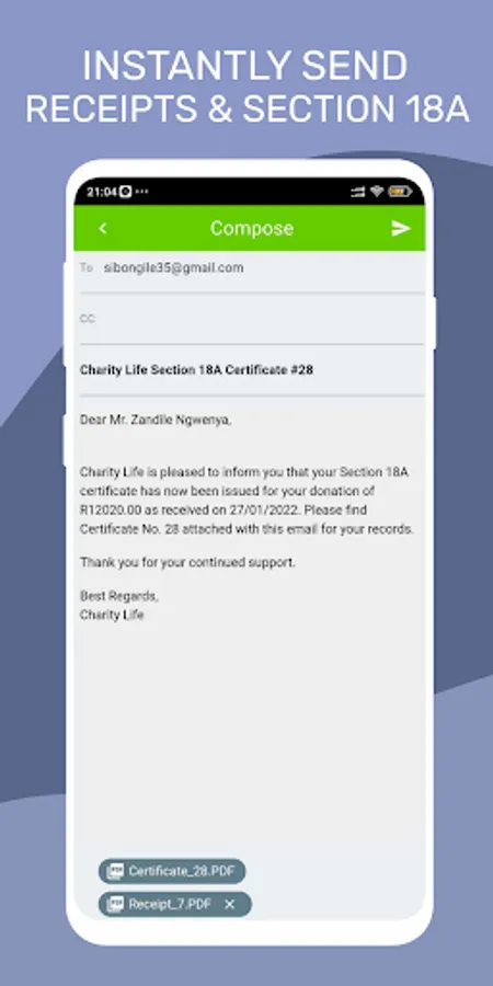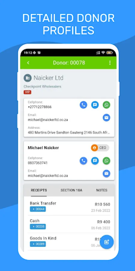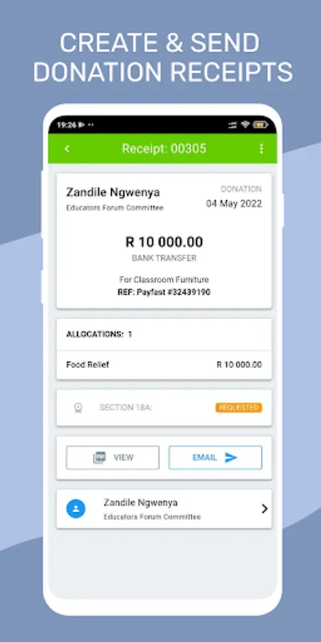 The ActiveDonor mobile app lets you easily engage with your donors, create donation receipts and access Section 18A tax certificates from your mobile device.