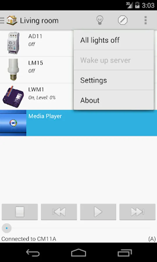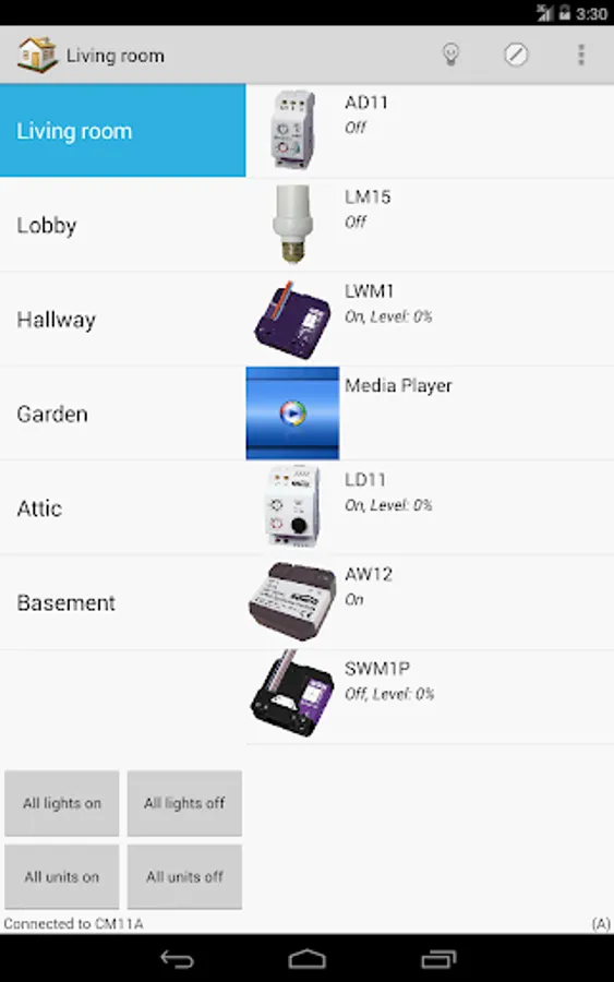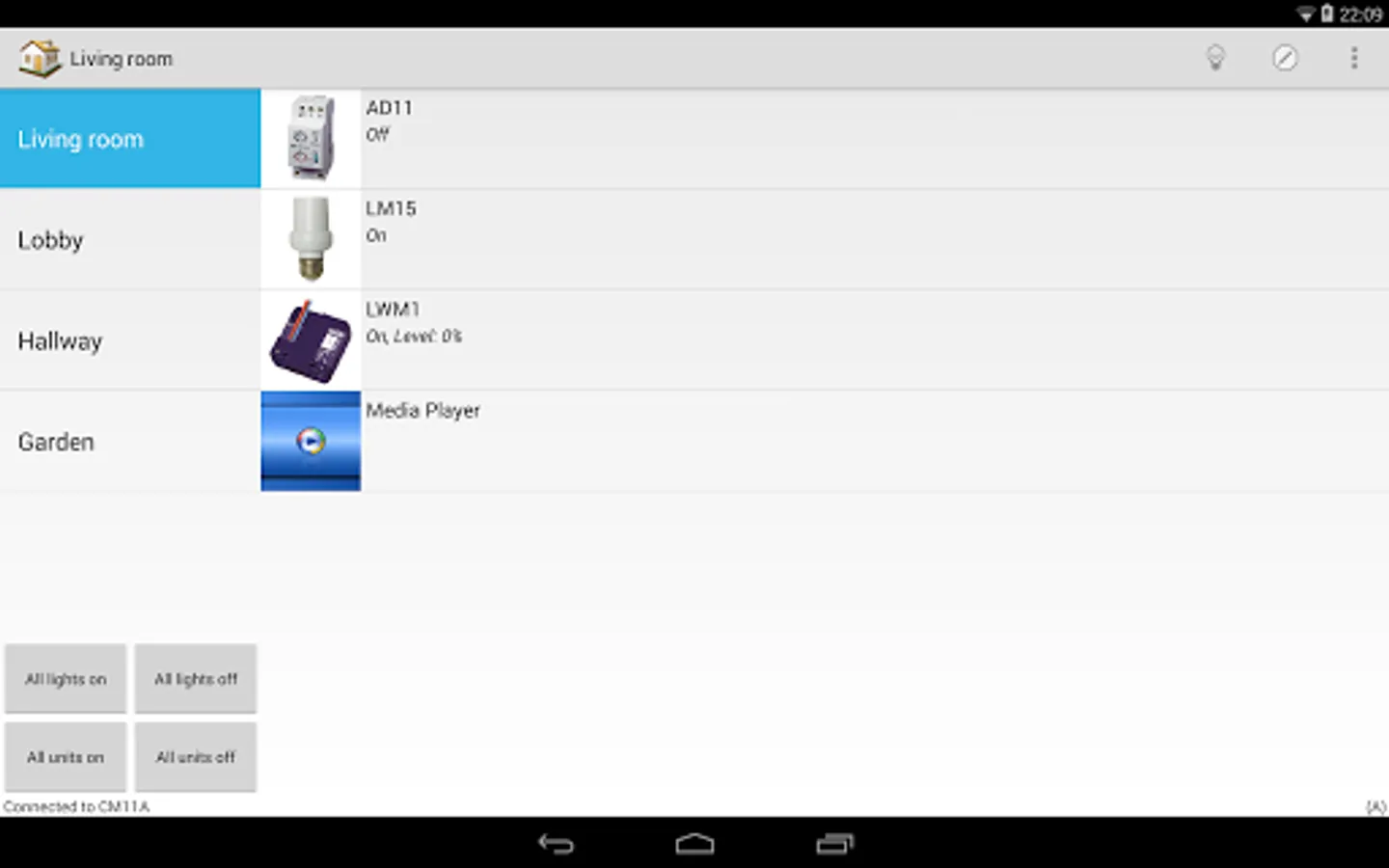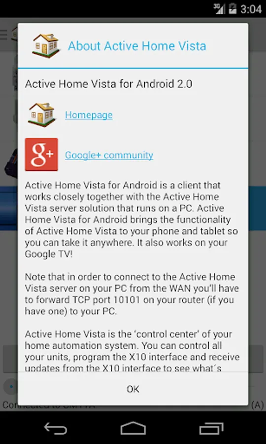 This application offers you the ability to control and monitor X10 devices from your Android phone and tablet. It also works on your Google TV! It connects to an Active Home Vista server on a PC (supported interfaces: CM10, CM10A, CM11, CM11A, HA125, CM12, CM12A, CM15, CM15A, CM17A, CM19, CM19A, CP10, Universal Devices ISY-99 & XTB-232). Also including a 1x1 widget to turn your devices on and off from your home screen.