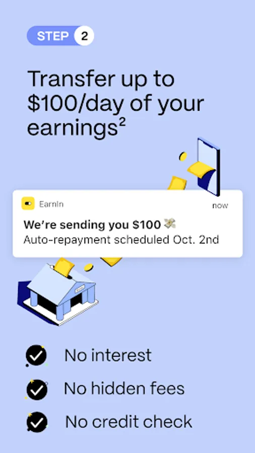 EarnIn is a simple way to access your earnings before payday—and live life on your terms. Get up to $100/day or $750/paycheck to cover any expense.[5] Plus, keep your credit goals moving with free credit monitoring right from the EarnIn app.