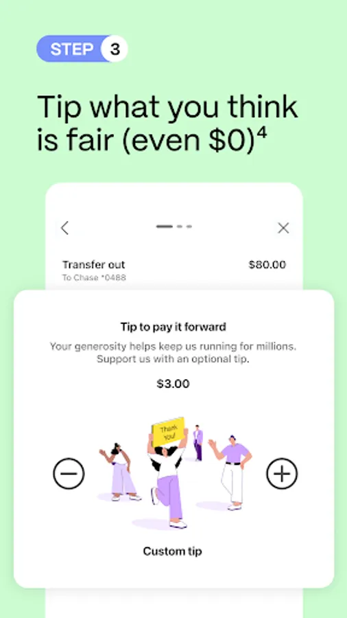 [3] Tip Yourself Account funds are held with Evolve Bank & Trust, member FDIC and FDIC insured up to $250,000. Tip Yourself is a 0% Annual Percentage Yield and $0 monthly fee service. Your Tip Yourself Account and any Tip Jars are not Savings Accounts.
