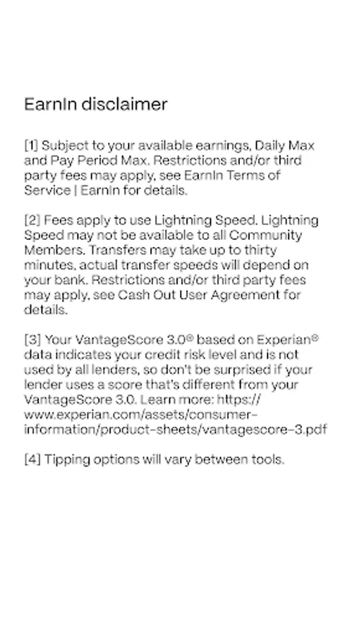 EarnIn is not affiliated with Chime, Dave, Albert, Brigit, CashNetUSA, Empower, Klover, MoneyLion, Cleo, Cash App, Daily Pay, Google Pay or Credit Karma.