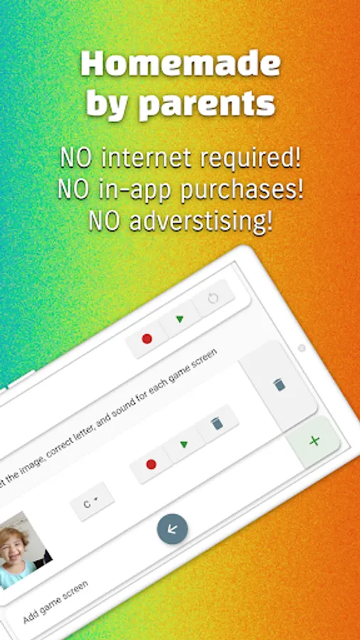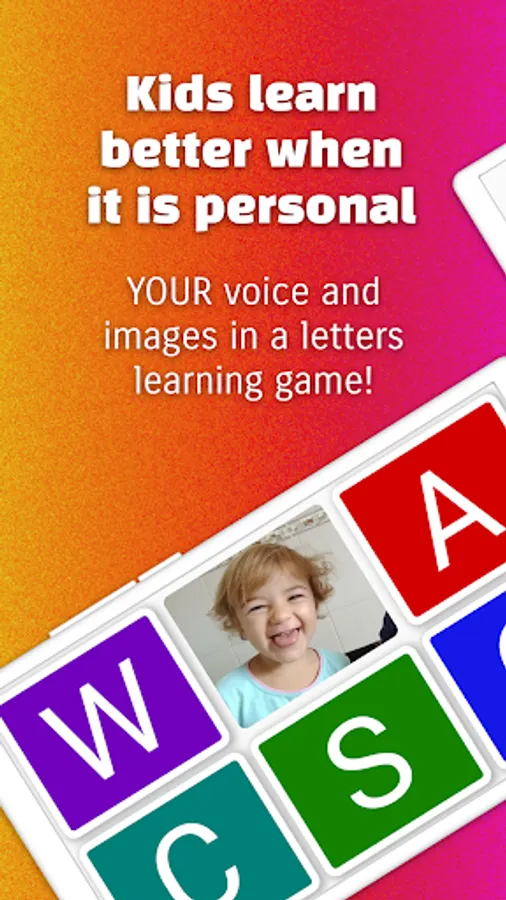 This is a letters learning game where each screen presents an image and 5 letters, for the kid to point the first letter of that image's word. However in this game you can set customized images and record sounds for each screen! YOUR voice asking to find the right letter of mommy's name will have meaning for your child, differently from other general games and toys! Give it a try!
