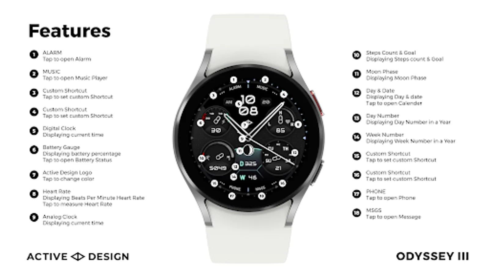 Experience the future of wearable technology with the ODYSSEY 3 Watch Face. With its sleek design and advanced features, you'll never have to compromise style for functionality. Stay on top of your schedule, track your fitness and stay connected with ease, all with the ODYSSEY 3 Watch Face.