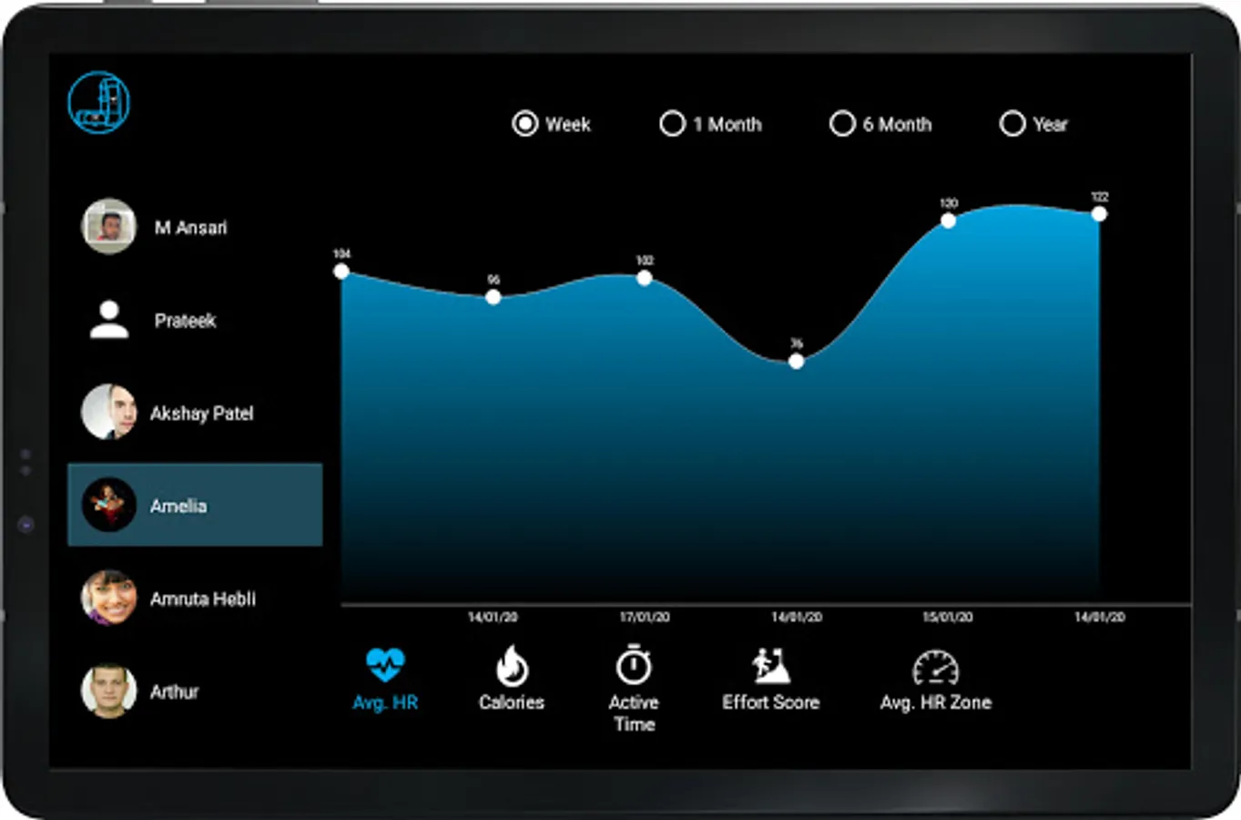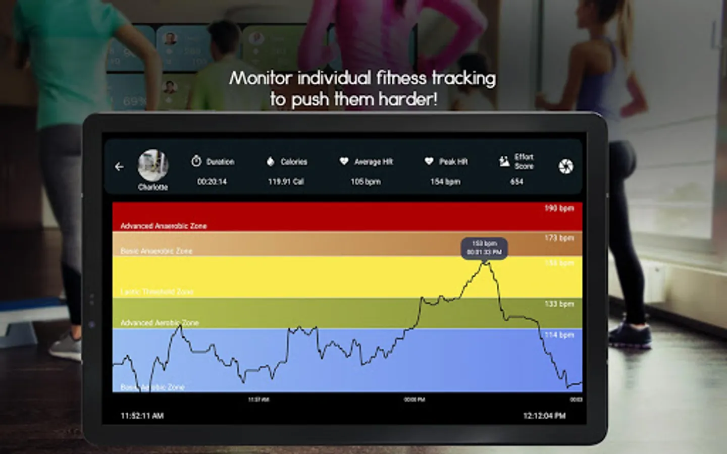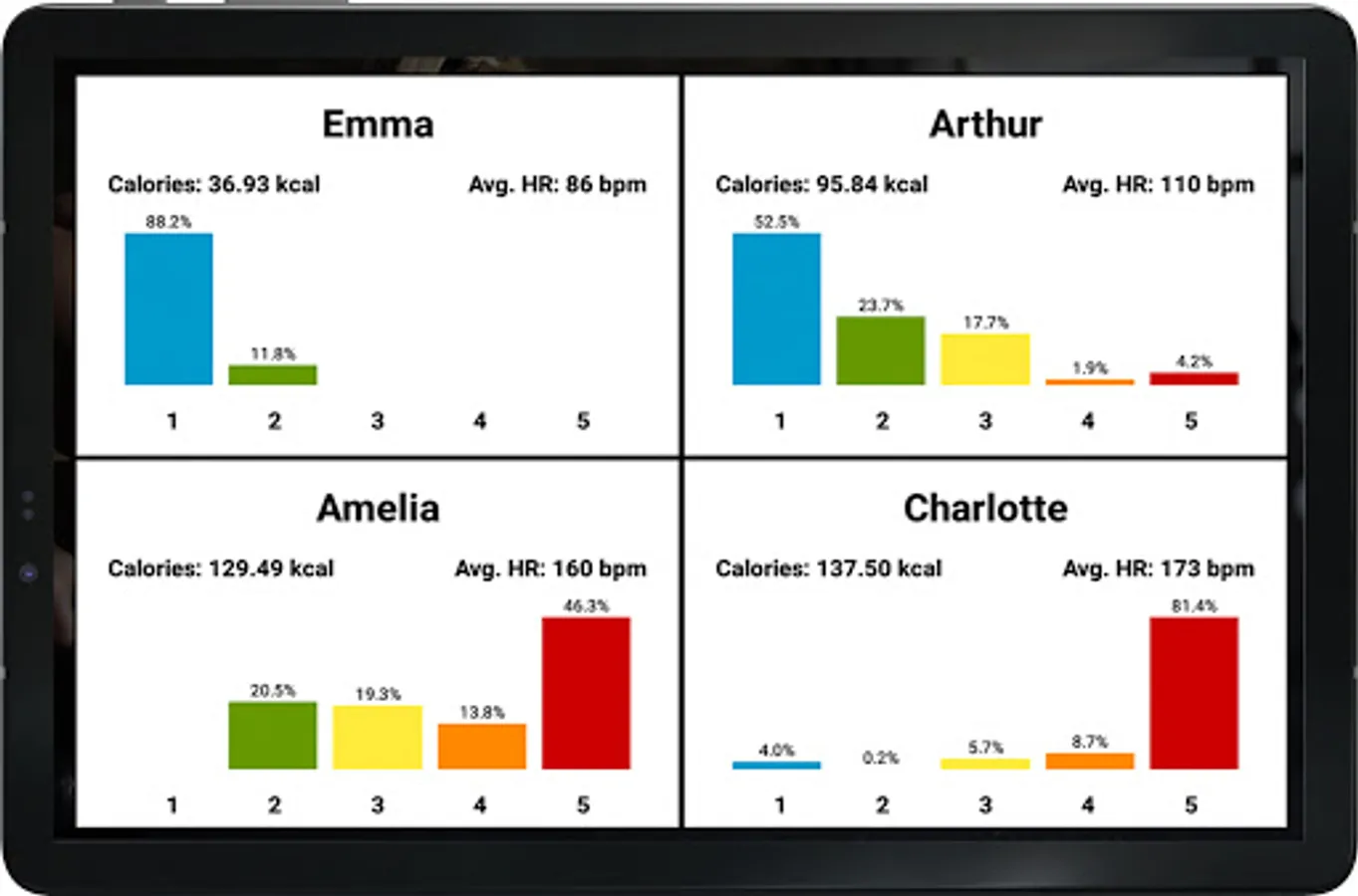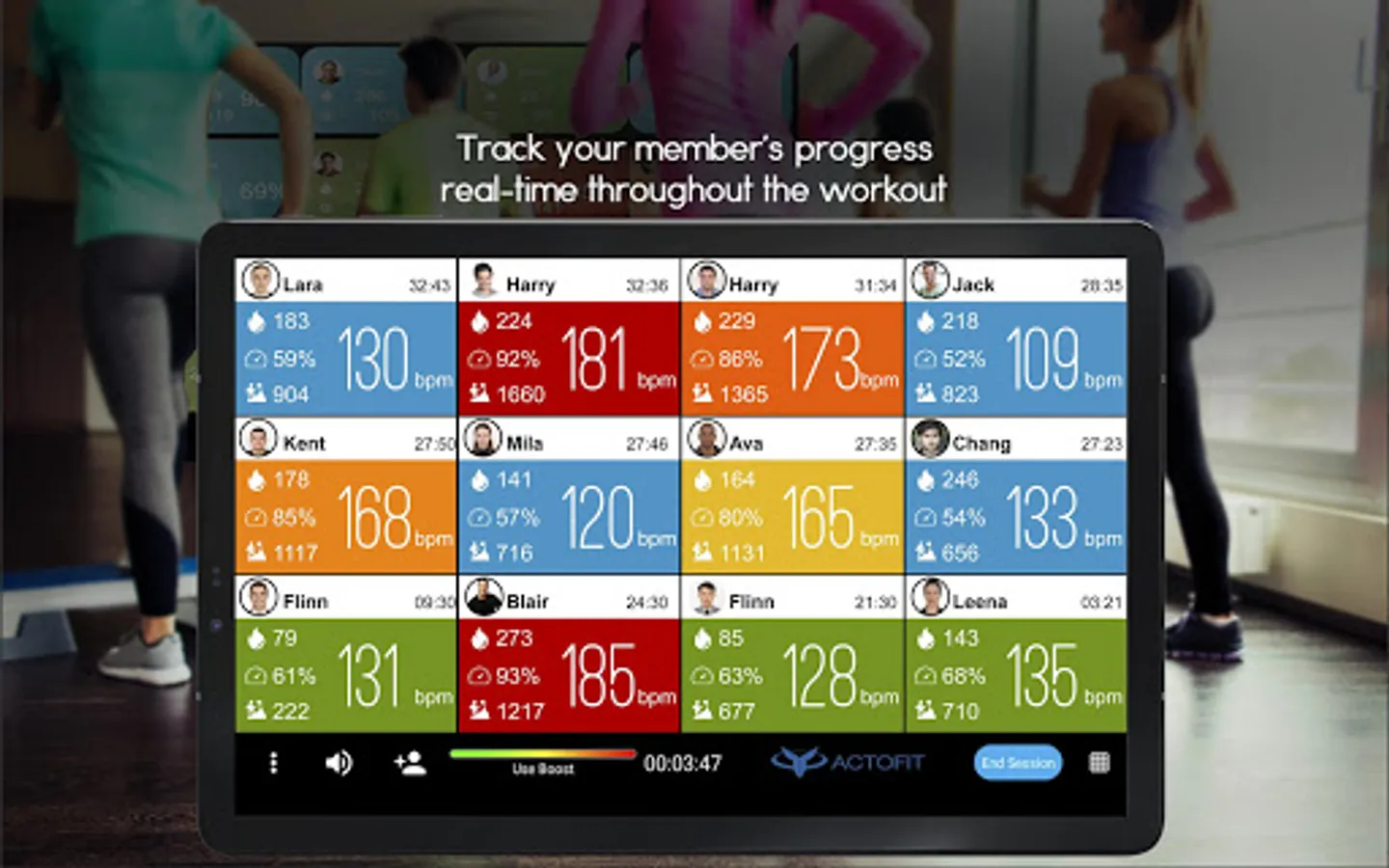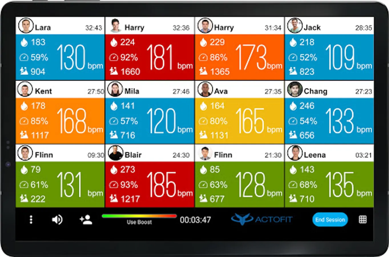 2. Each members heart rate, heart rate zone, real time calorie burns, session duration, intensity levels, effort score are shown on each grid of the screen.