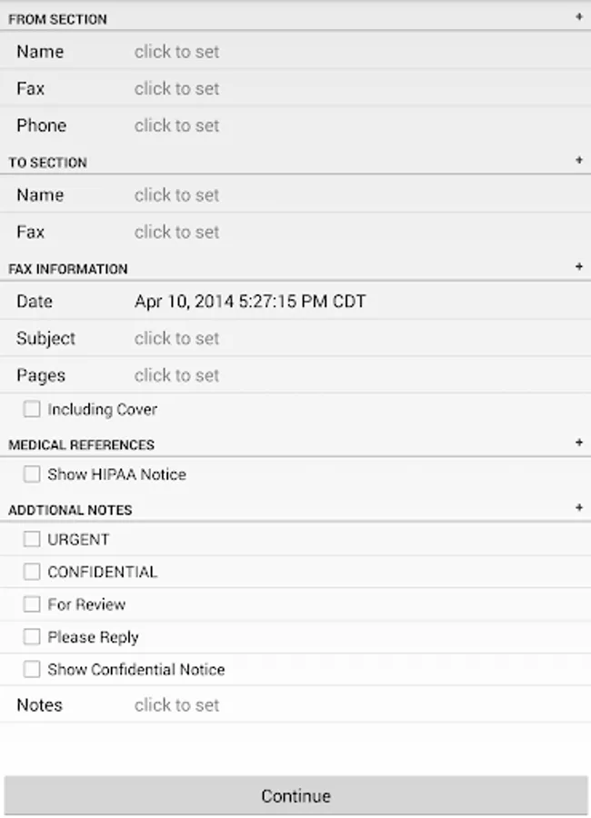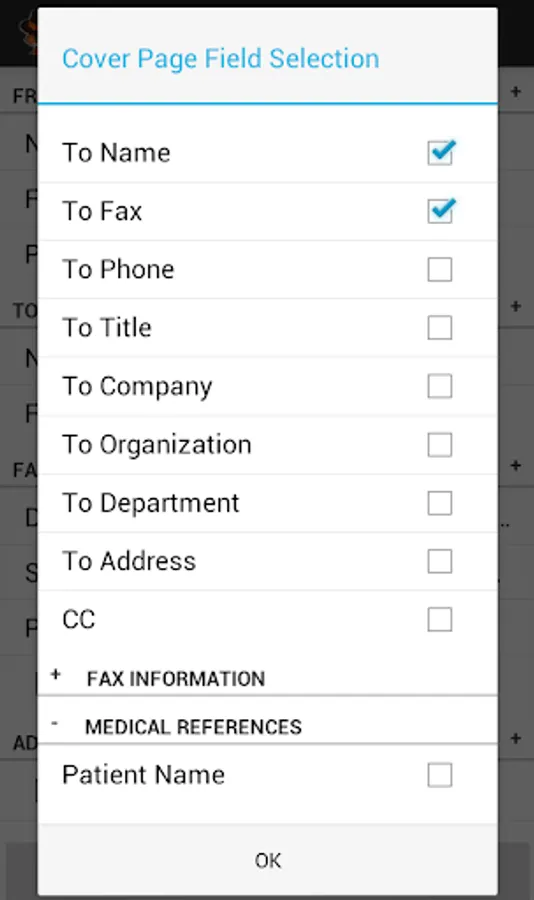 Choose which fields you what to show on your fax cover sheet. Fax pages can include a note section for your typed in message to your recipient.