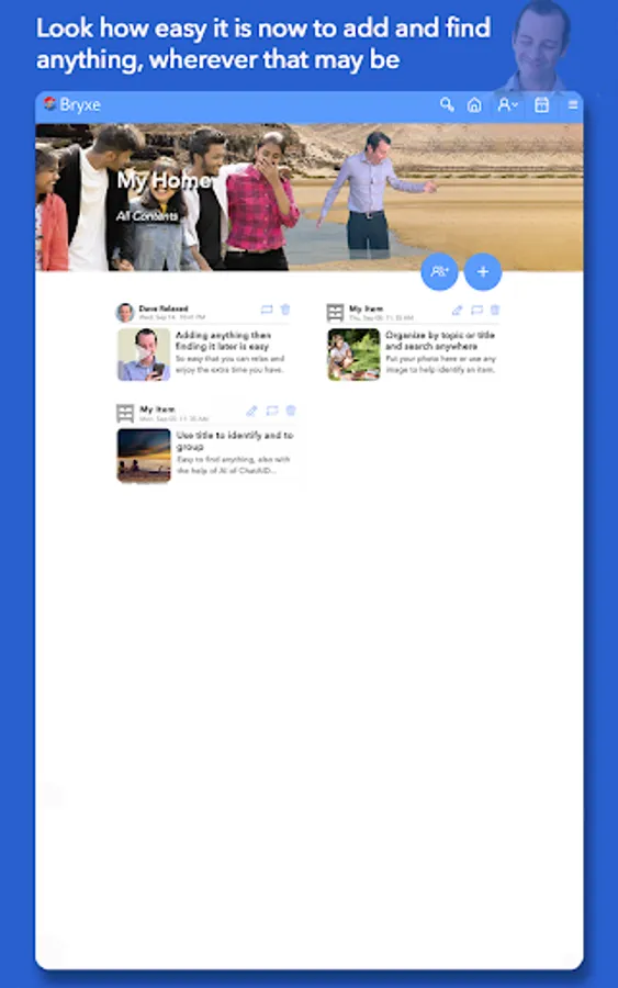 Bryxe makes it easy to add and find anything (photos, videos or whatever else you need and use). Imagine not having to scroll through endless folders, devices and even mundane drawers and cabinets anymore. It'll be all right there at your fingertips.