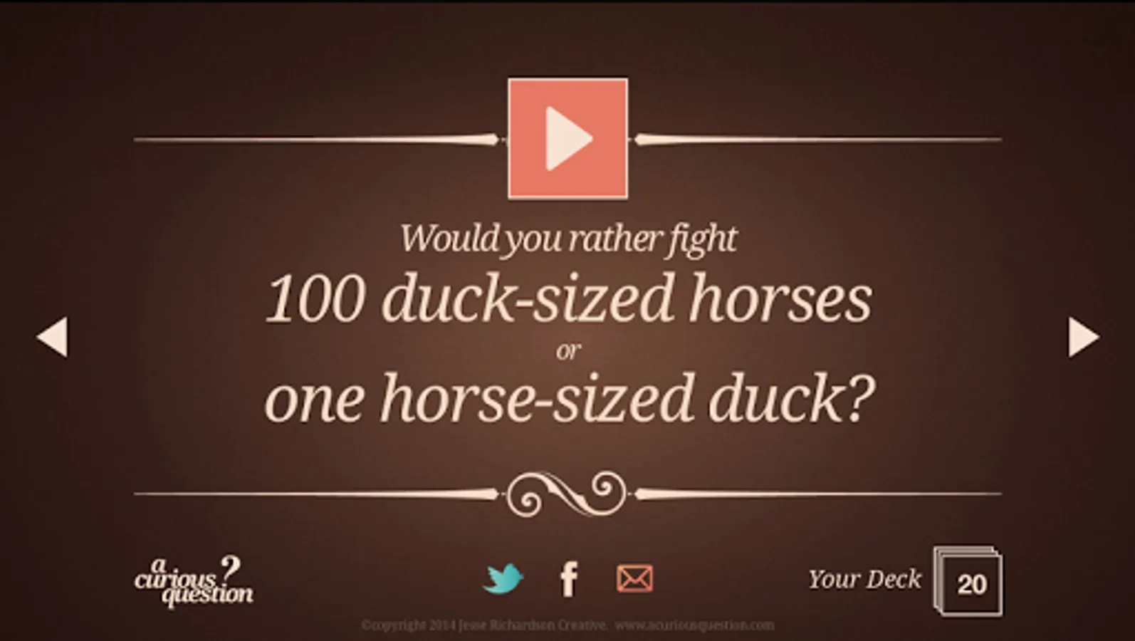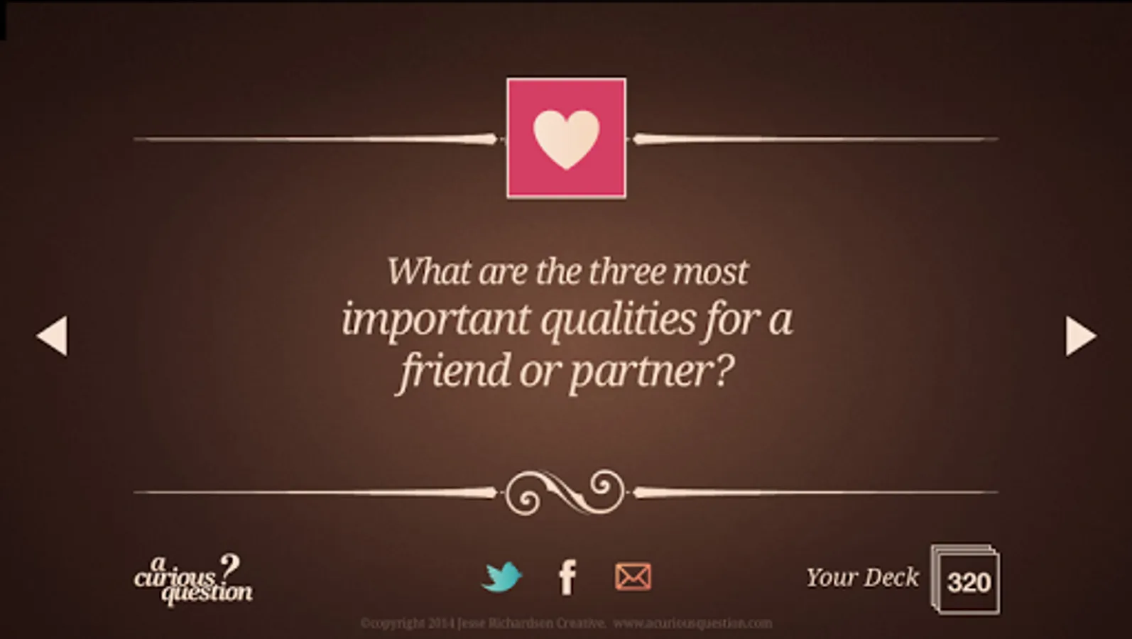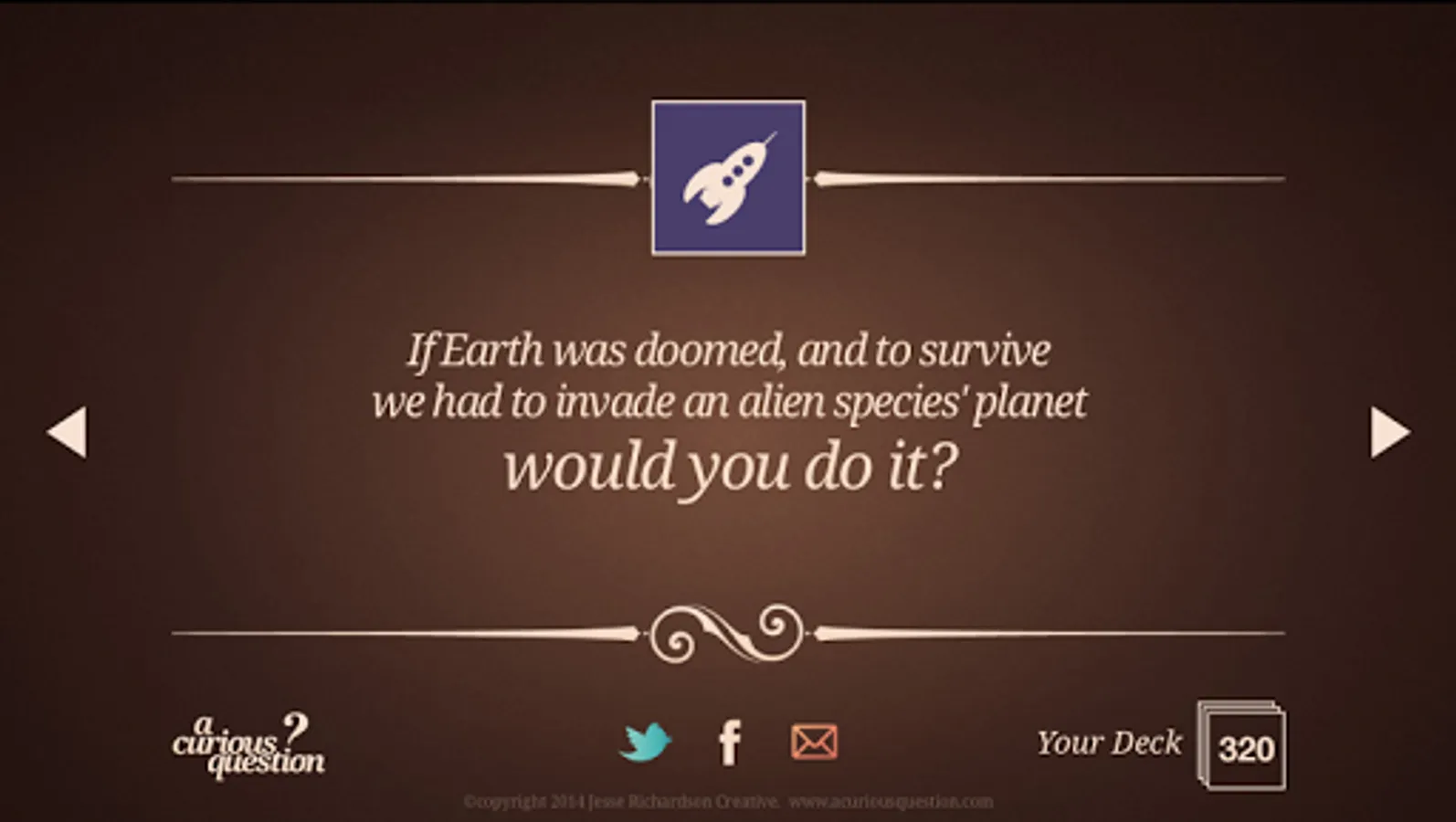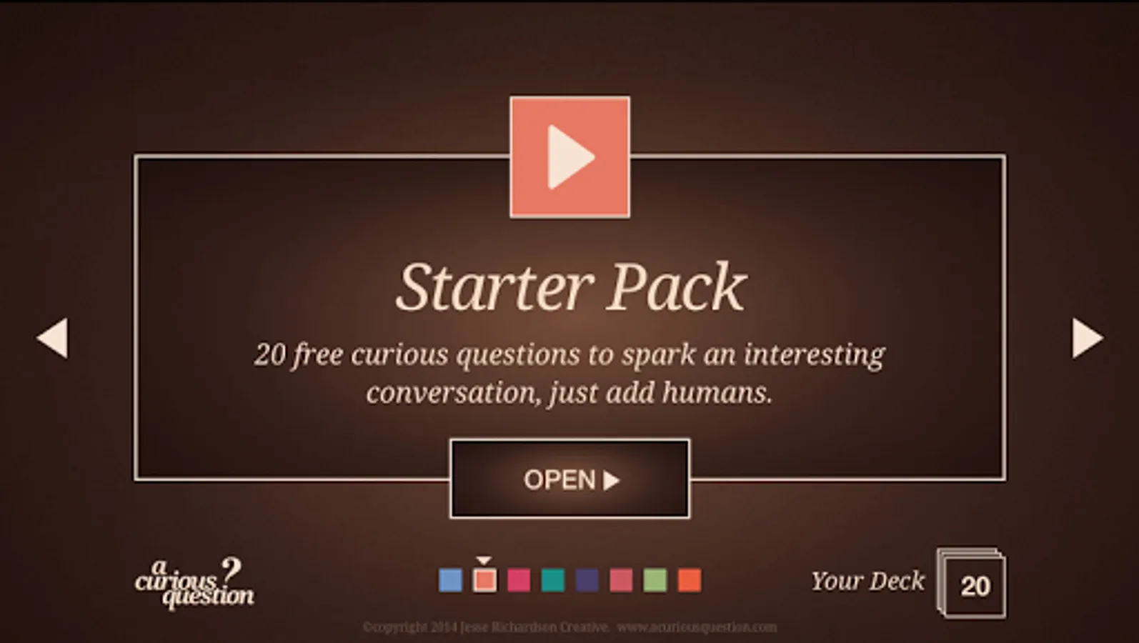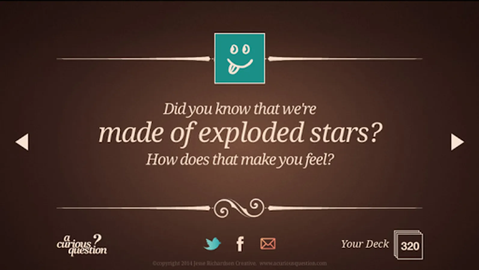 Introducing A Curious Question - it’s an app that kick-starts a conversation to an immediately curious place. There’s more than 300 genuinely interesting questions, all designed to make people do that sideways things with their head, where they furrow their brow in contemplation and go ‘hmmm’.