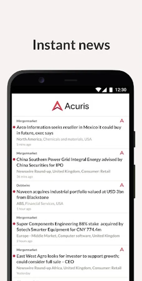 The Acuris App delivers your personalised news alerts directly to your Android phone. All content is delivered based on your interests and preferences and is stored on your device for 30 days, providing off-line reading wherever you are.