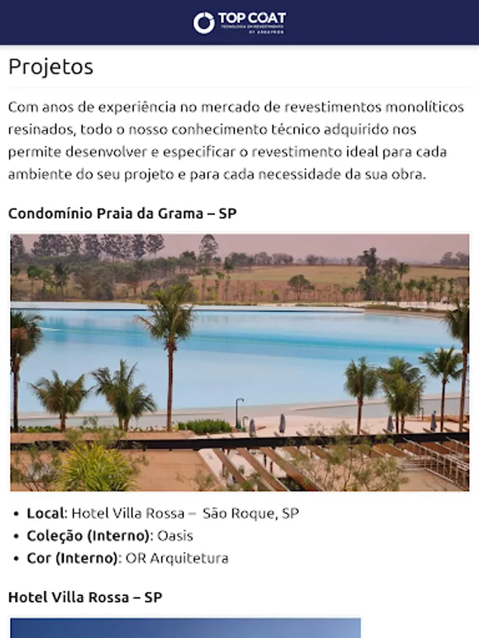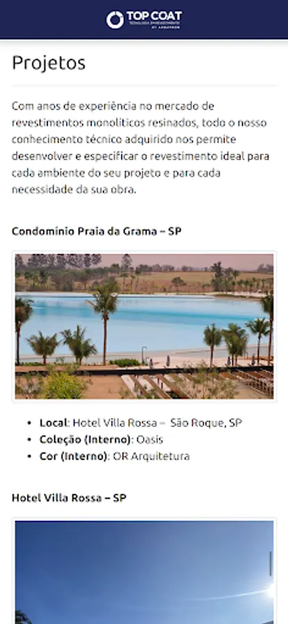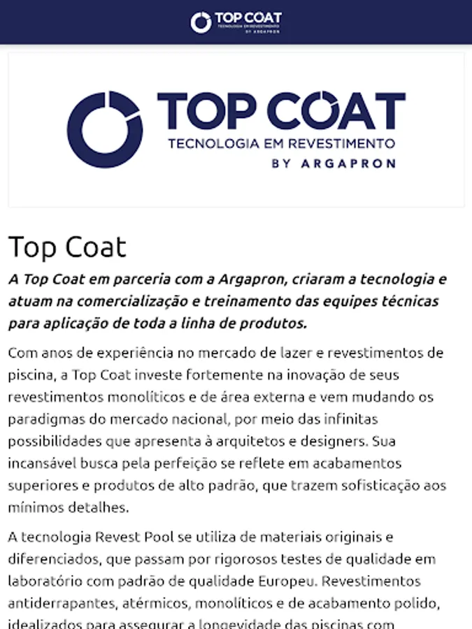 With this application, you will have access to our main projects, catalogs and product line, videos, list of licensees throughout Brazil and still stay on top of the news presented by Top Coat – Tecnologia em Revestimento.