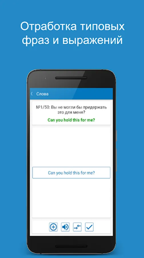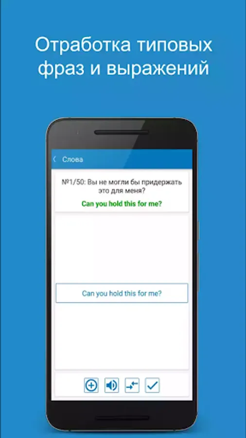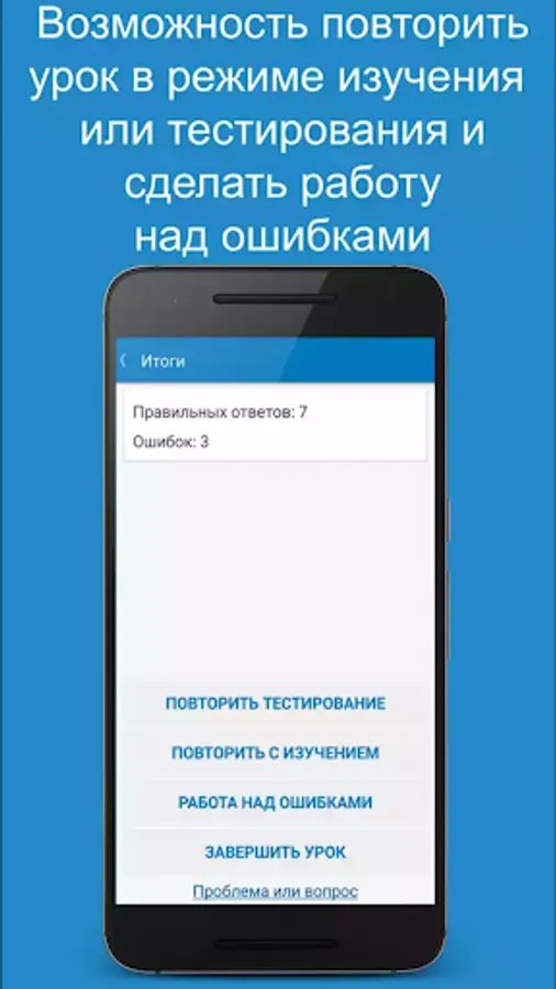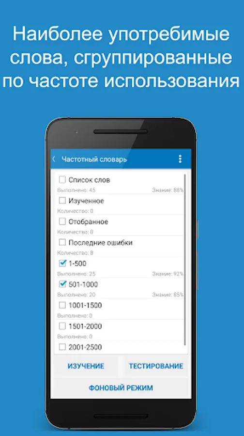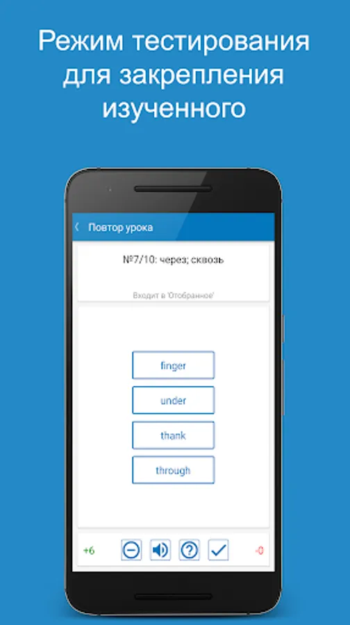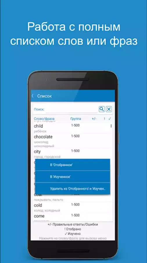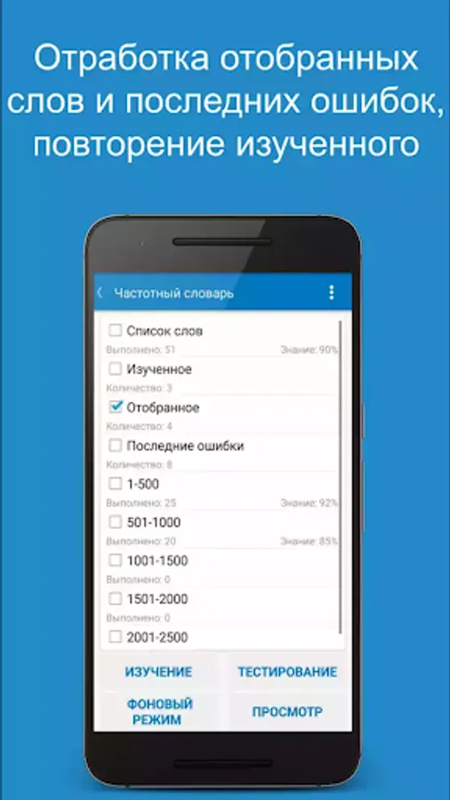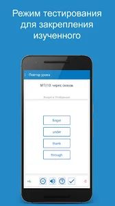A lesson (in the βWordsβ section) can be held in the learning mode for memorizing new words, or in the testing mode for assessing knowledge and consolidating what has been learned. You can take the opportunity to create your list for study - "Selected". After the lesson, the application offers to perform work on the errors, or repeat the lesson as a whole in the mode of study or testing. Also, all recent errors are recorded in the "Recent errors" section, which allows you to work out the words that caused difficulties. Well-known words can be labeled as "Learned."
