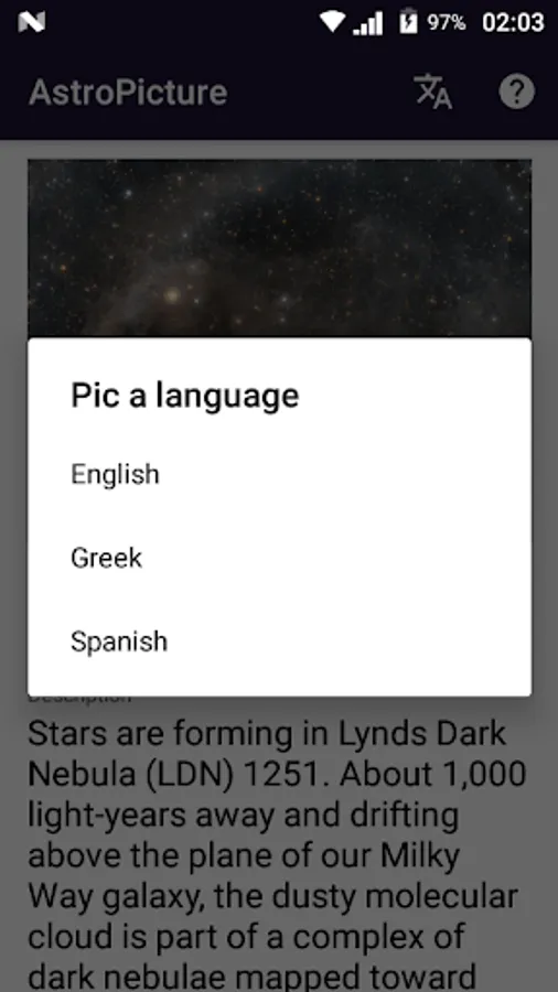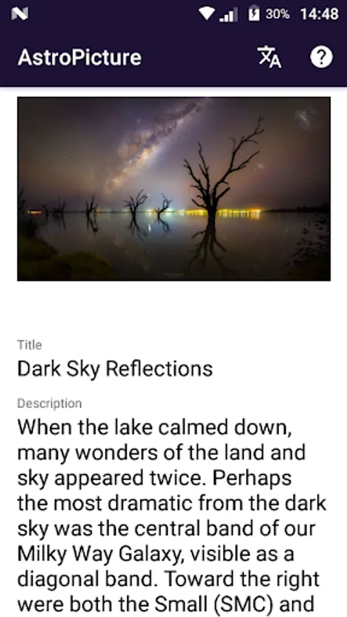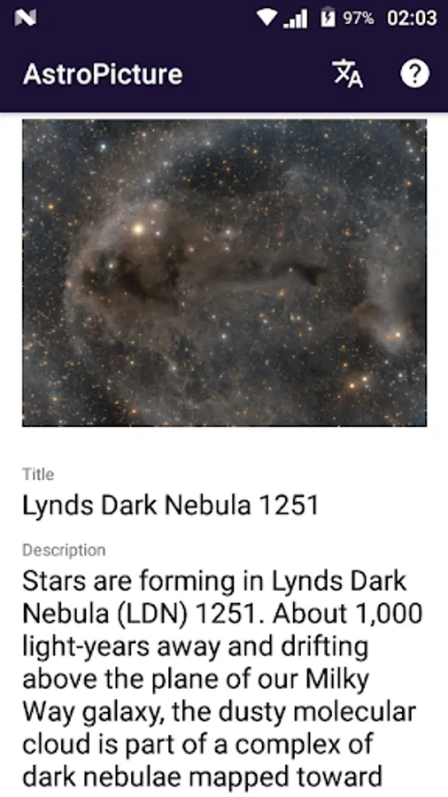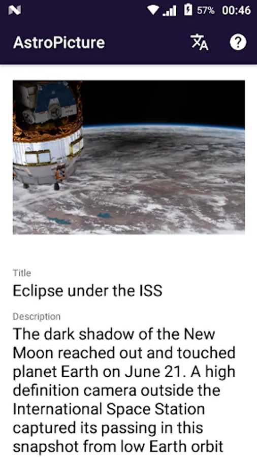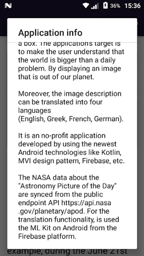 This application displays the "Astronomy Picture of the Day", synced by the public data of NASA.