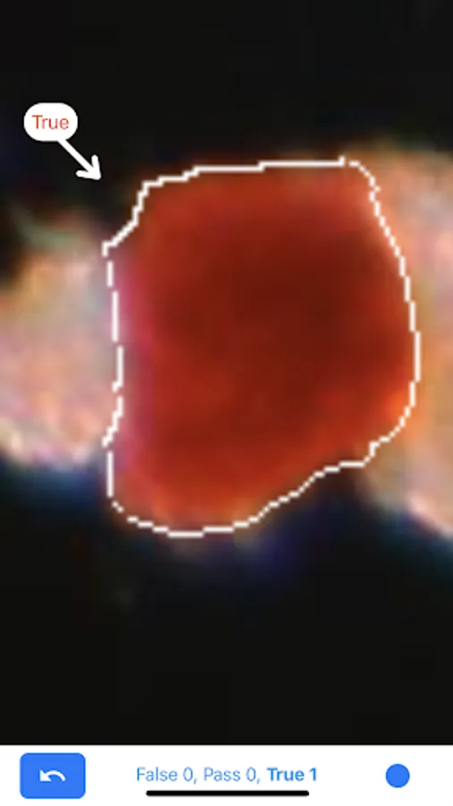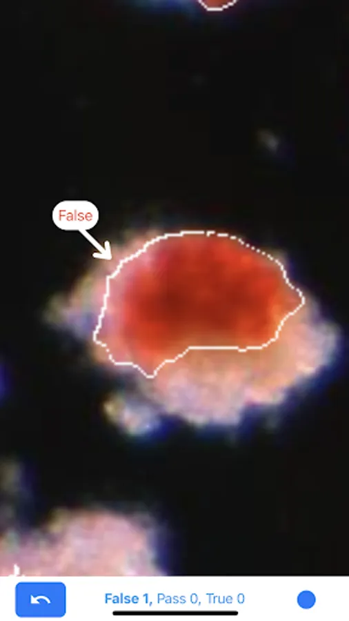 The total number of images and islets awaiting the user in the active set is visualized at the top. Three images of the active set are uploaded. For each microscopic image the quality is to be evaluated. A simple swipe gesture can be used by the user to classify contours of selected individual islets marked by arrows as true or false, or to abstain from evaluating. The overall quality of the islet contours are then evaluated. The application is designed as game with Hall of fame and awards.