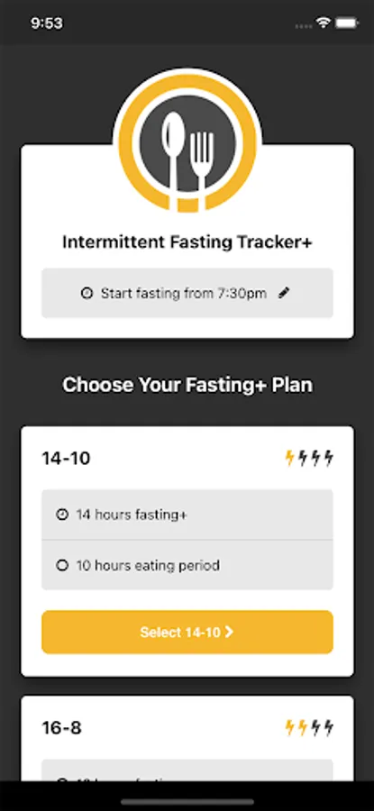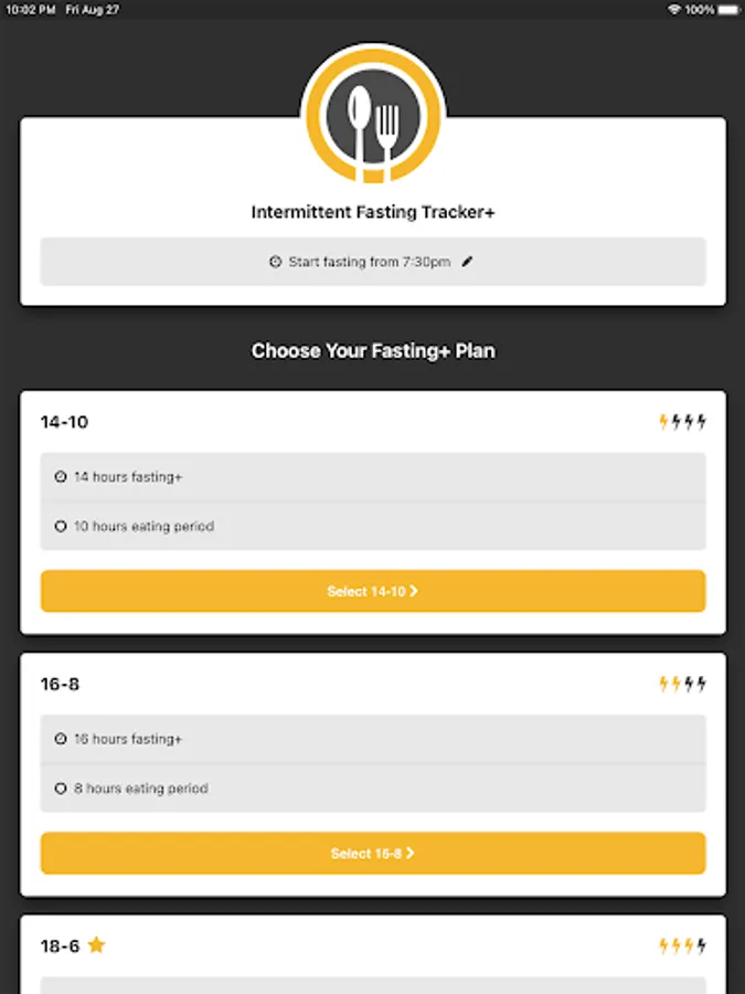 Fast Tracker & Timer guides you through the process of choosing an intermittent fasting plan: 14/10, 16/8, 18/6, 20/4 and 22/2. Or select your own custom routine.