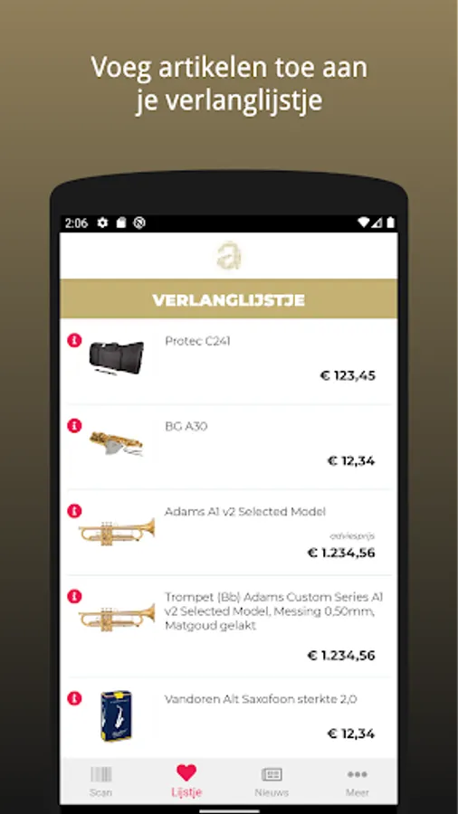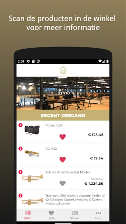 Use the scan function to get more information about the articles when you are in an Adams Music Center. See directly the price and properties of the scanned article and compare it with other articles. No account is required to scan the articles. If you do have an account, you can save scanned articles in a list to find them later.