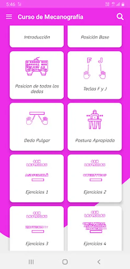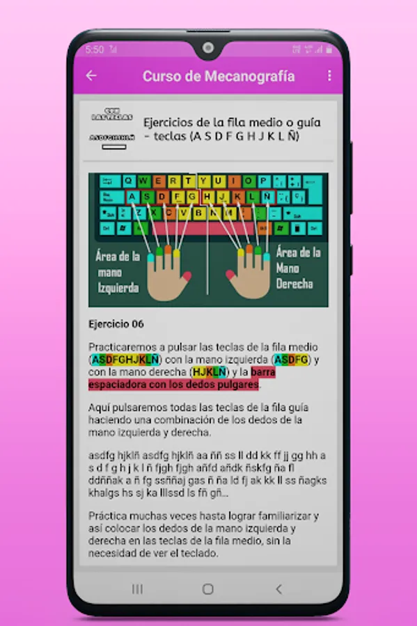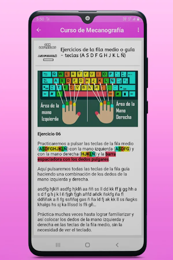 Enjoy the new application Typing Course Available for Android devices. Do not rush when you first start learning, go easy. Speed up and type faster only when your fingers hit the correct keys out of habit. Give yourself time when writing to avoid mistakes. Free Typing Course in Spanish is the application of typing exercises, which will help you to familiarize yourself on the correct position where each finger of the hands should be placed on the keyboard.