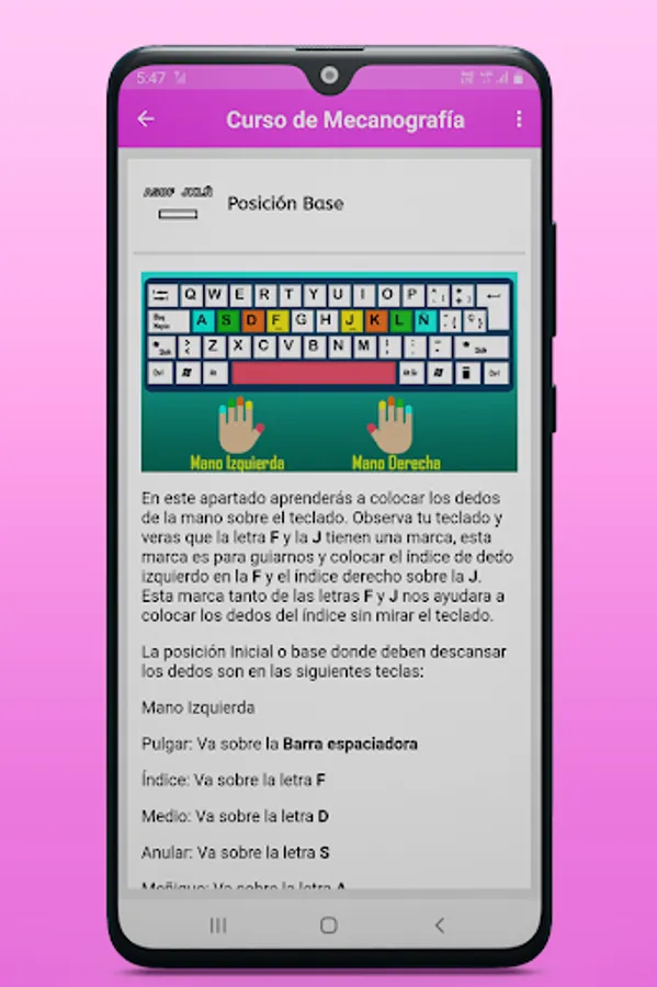 The new Learn Spanish Typing allows you to know all the skills that a professional in typing should know, such as the base position, use the 10 fingers to write, to write without seeing the keyboard, you will learn the correct location of each finger on the keyboard. Just move a ☝ finger.