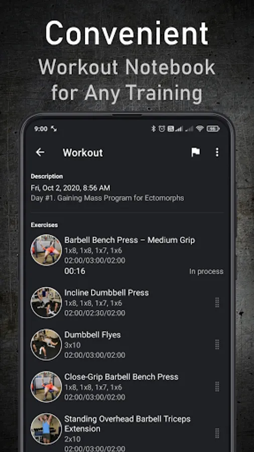 Record the results of your workouts in a convenient and logical way. Supersets, trisets, giantets, as well as circular training are supported. Recording of results occurs on the basis of previous ones, which simplifies and speeds up the process as much as possible. The rest timer will not let you relax too much and will signal the sound, vibration of the phone or fitness bracelet.