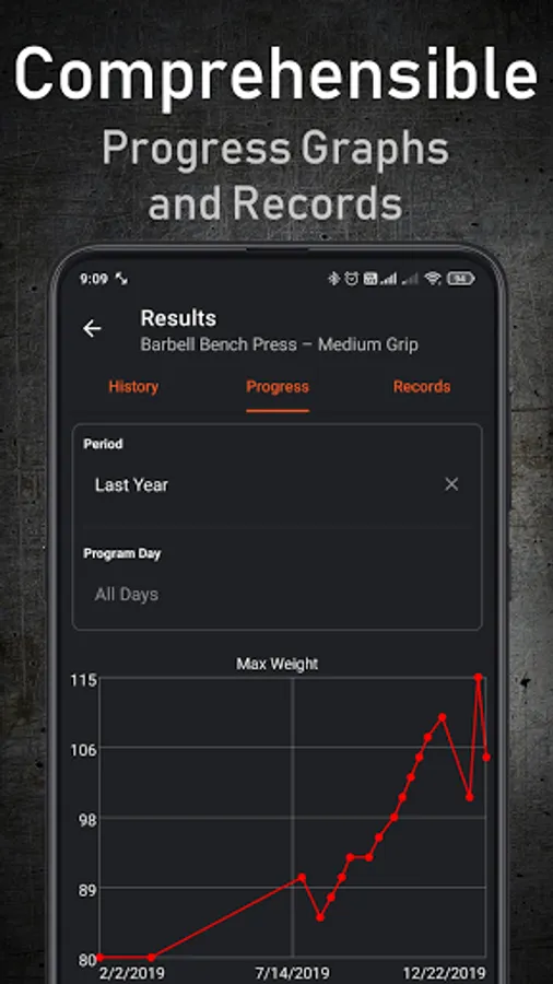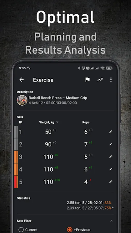 View the previous results of the exercise, build progress charts and get current records. Thanks to this information, you can quickly plan the current approaches - determine what is worth improving: weight, repetition, rest time or number of approaches. There are limitations.