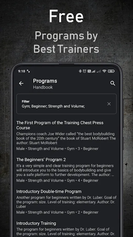 There are more than 60 selected programs from the best trainers. Using the filter, you can easily find the program for any purpose, including those aimed at losing weight, gaining weight, increasing strength. When filtering, you can also specify the gender, training location, desired frequency and your level of training. After choosing a suitable training program, you can adjust it in an arbitrary way (customized for yourself).