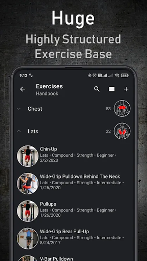 More than 500 training exercises are available. All exercises are described and structured as much as possible, descriptive images are available, both with men and with girls. Using a filter or search by name, you can easily find a suitable exercise. When filtering, you can specify a muscle group, the type of exercise, the type of equipment and effort, the level of proficiency.