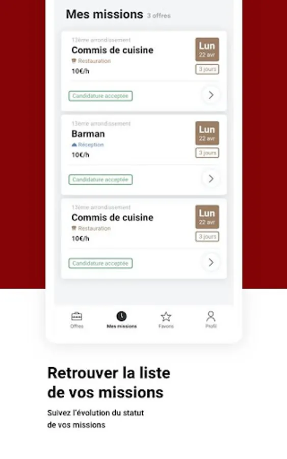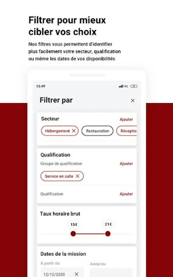 My Adaptel also allows all those who are looking for a job in Hospitality & Catering to find the missions corresponding to their experiences and their availability.