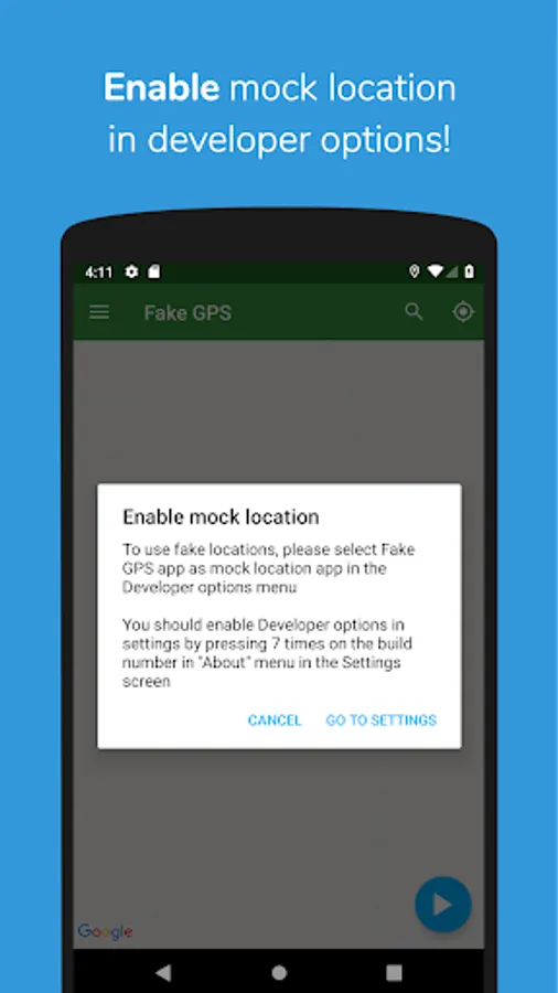 - Allow mock locations under Developer settings (Applications).