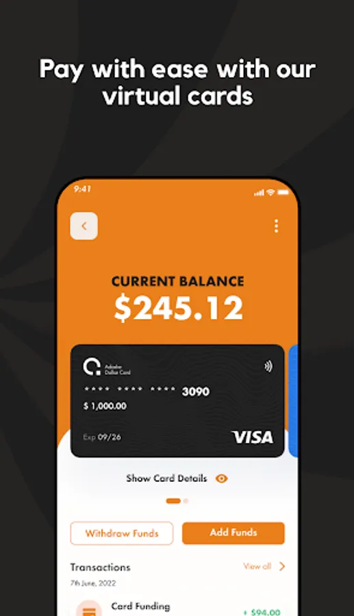 You can create virtual cards on Adashe. This feature allows you to make online payments without having to reveal your personal banking information. With our virtual cards, you can enjoy secure and borderless transactions no matter where you are in the world.