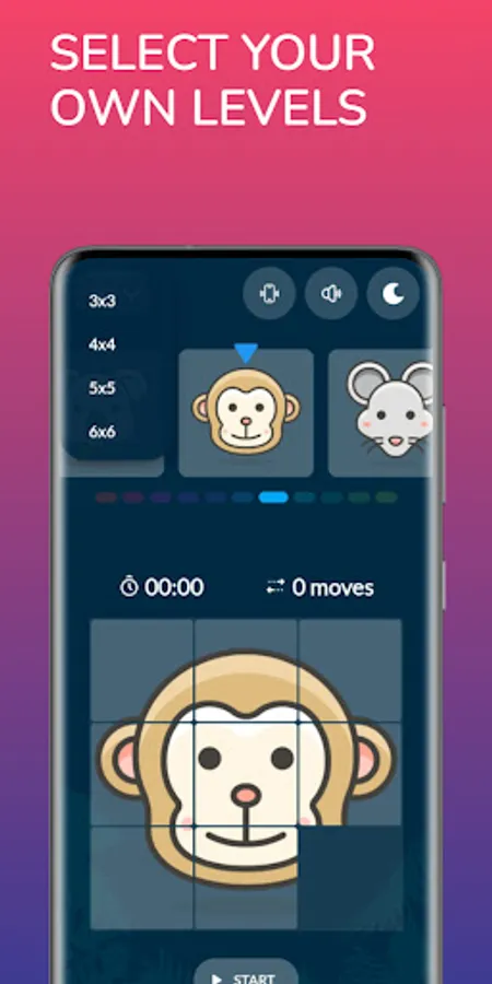 > 3x3, 4x4, 5x5, 6x6 Select your own level