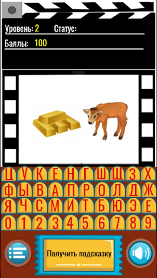 For each guessed kinorebus you get +100 points, for the wrongly pressed letter -10 penalty.