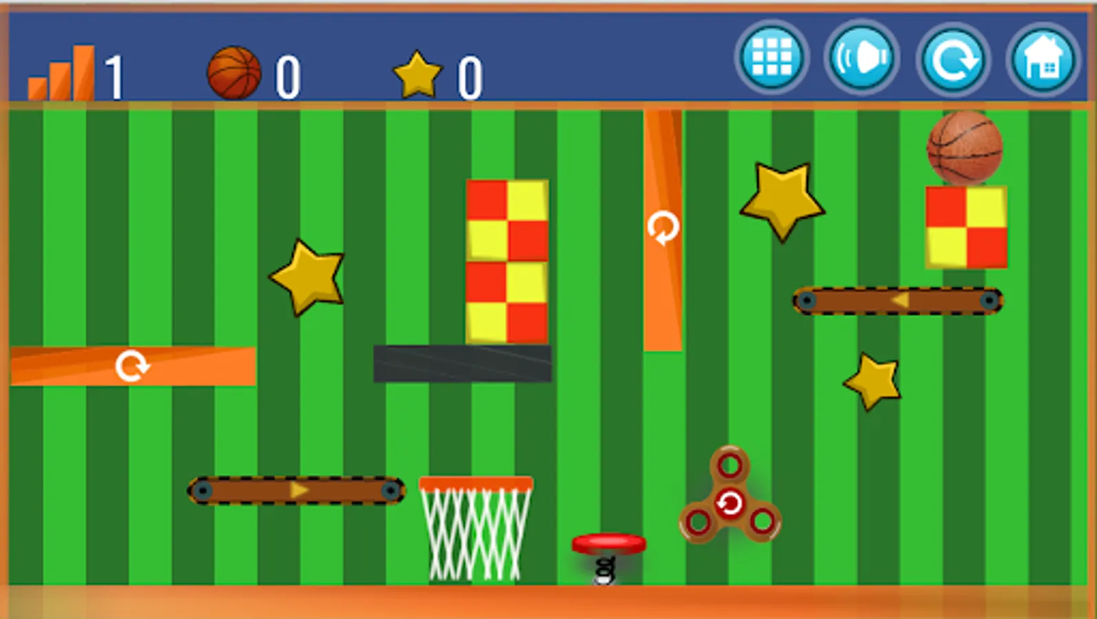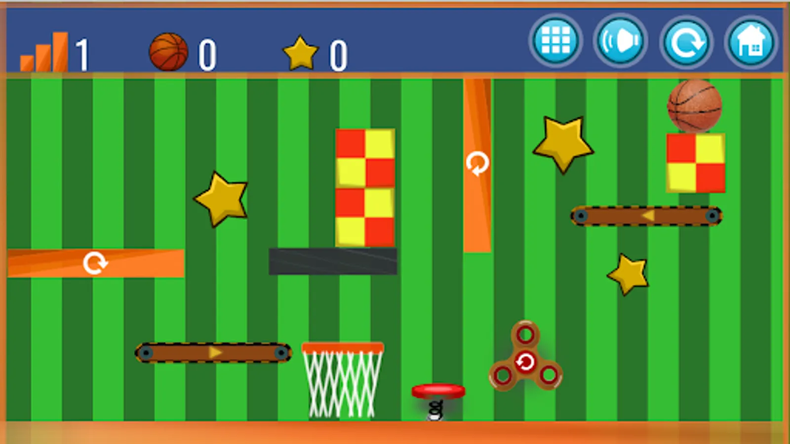 The object of the game is to throw a basketball into the basket using various objects: a clapper box, wooden blocks, spinners, escalators, etc. If you fail, try changing the order of "clicking" on items or changing their properties.